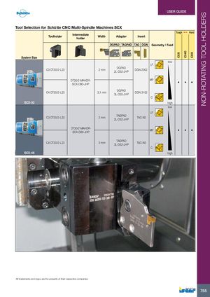 IC830 IC5400 IC808 NON-ROTATING TOOL HOLDERS USER GUIDE Tool Selection for Schütte CNC Multi-Spindle Machines SCX Tough 1 Hard Toolholder Intermediateholder Width Adapter Insert DGPAD TAGPAD TAG DGN Geometry / Feed System Size low LF C3 DT30/2-L23 2 mm DGPAD2L-D32-JHPDGN 2002 DT30/2 MAHDR-SCX-D80-JHP MF • • • C4 DT30/2-L23 3,1 mm DGPAD3L-D32-JHPDGN 3102 C SCX-32 high low LF C3 DT30/2-L23 2 mm TAGPAD2L-D52-JHPTAG N2 DT30/2 MAHDR-SCX-D80-JHP MF • • • C4 DT30/2-L23 3 mm TAGPAD3L-D52-JHPTAG N3 C SCX-46 high All trademarks and logos are the property of their respective companies 755