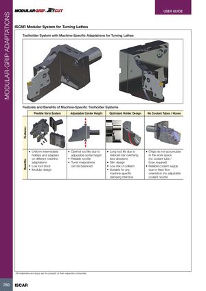 MODULAR-GRIP ADAPTATIONS Features:Benefits: · USER GUIDE ISCAR Modular System for Turning Lathes Toolholder System with Machine-Specific Adaptations for Turning Lathes Features and Benefits of Machine-Specific Toolholder Systems Flexible Vario System Adjustable Center Height Optimized Holder Design No Coolant Tubes / Hoses • Uniform intermediate • Optimal tool life due to • Long tool life due to • Chips do not accumulate holders and adapters adjustable center height reduced bar overhang, in the work space on different machine • Reliable tool life less vibrations (no coolant tube / adaptations • Turret malpositions • Slim design hose required) • Low tool stock can be balanced • Low risk of collision • Reliable coolant supply • Modular design • Suitable for any due to fixed flow machine-specific orientation (no adjustable clamping interface coolant nozzle) All trademarks and logos are the property of their respective companies 760 ISCAR