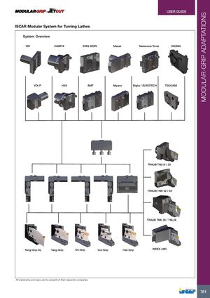 MODULAR-GRIP ADAPTATIONS · USER GUIDE ISCAR Modular System for Turning Lathes System Overview VDI CAMFIX DMG MORI Mazak Nakamura-Tome OKUMA VDI-P HSK BMT Miyano Biglia / EUROTECH TSUGAMI TRAUB TNL18 / 32 TRAUB TNK 42 / 65 TRAUB TNK 36 / TNL26 Tang-Grip-XL Tang-Grip Do-Grip Cut-Grip Heli-Grip INDEX ABC All trademarks and logos are the property of their respective companies 761