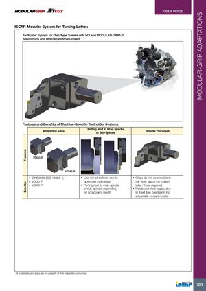 Features:Benefits: MODULAR-GRIP ADAPTATIONS · USER GUIDE ISCAR Modular System for Turning Lathes Toolholder System for Disc-Type Turrets with VDI and MODULAR-GRIP-XL Adaptations and Directed Internal Coolant Features and Benefits of Machine-Specific Toolholder Systems Adaptation Sizes Parting Next to Main Spindleor Sub-Spindle Reliable Processes VDI30-P VDI40-P • DIN69880 (ISO 10889-1) • Low risk of collision due to • Chips do not accumulate in • VDI30-P optimized tool design the work space (no coolant • VDI40-P • Parting next to main spindle tube / hose required) or sub-spindle depending • Reliable coolant supply due on component length to fixed flow orientation (no adjustable coolant nozzle) All trademarks and logos are the property of their respective companies 763