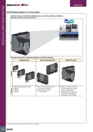 MODULAR-GRIP ADAPTATIONS Features:Benefits: · USER GUIDE ISCAR Modular System for Turning Lathes Toolholder System for DOOSAN / HAAS Machines with BMT and MODULAR-GRIP-XL Adaptations and Directed Internal Coolant Features and Benefits of Machine-Specific Toolholder Systems Adaptation Sizes Holder Turning Ability 180° Reliable Processes BMT45 BMT55 BMT65 • BMT (Base Mounted Turret) • Tool can be mounted on the • Chips do not accumulate in • BMT45 left or right of the turret the work space (no coolant • BMT55 • Extremely flexible due tube / hose required) • BMT65 to few elements • Reliable coolant supply due to fixed flow orientation (no adjustable coolant nozzle) All trademarks and logos are the property of their respective companies 764 ISCAR