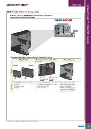 Features:Benefits: MODULAR-GRIP ADAPTATIONS · USER GUIDE ISCAR Modular System for Turning Lathes Toolholder System for DMG MORI Machines with MODULAR-GRIP-XL Adaptation and Directed Internal Coolant Features and Benefits of Machine-Specific Toolholder Systems Adaptation Sizes Two Pockets for Intermediate Holders Reliable Processes (For MORI60) MORI40 MORI60 1. pocket 2. pocket next ø 40 ø 60 next to (main) to (sub-) spindle spindle • DMG MORI turrets for NZ machines • Intermediate holder can be mounted • Chips do not accumulate in • MORI40 on the left or right side of the turret the work space (no coolant • For NL machines • Modular flexibility due tube/hose required) • MORI60 to few elements • Reliable coolant supply due to fixed flow orientation (no adjustable coolant nozzle) All trademarks and logos are the property of their respective companies 765