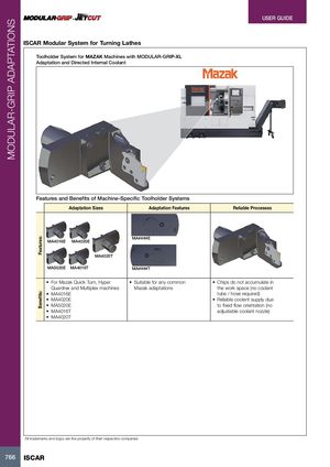 MODULAR-GRIP ADAPTATIONS Features:Benefits: · USER GUIDE ISCAR Modular System for Turning Lathes Toolholder System for MAZAK Machines with MODULAR-GRIP-XL Adaptation and Directed Internal Coolant Features and Benefits of Machine-Specific Toolholder Systems Adaptation Sizes Adaptation Features Reliable Processes MA####E MA4016E MA4020E MA4020T MA5020E MA4016T MA####T • For Mazak Quick Turn, Hyper • Suitable for any common • Chips do not accumulate in Quardrex and Multiplex machines Mazak adaptations the work space (no coolant • MA4016E tube / hose required) • MA4020E • Reliable coolant supply due • MA5020E to fixed flow orientation (no • MA4016T adjustable coolant nozzle) • MA4020T All trademarks and logos are the property of their respective companies 766 ISCAR