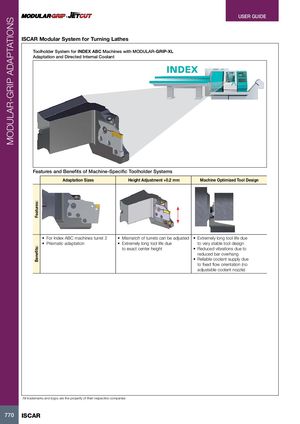 MODULAR-GRIP ADAPTATIONS Features:Benefits: · USER GUIDE ISCAR Modular System for Turning Lathes Toolholder System for INDEX ABC Machines with MODULAR-GRIP-XL Adaptation and Directed Internal Coolant Features and Benefits of Machine-Specific Toolholder Systems Adaptation Sizes Height Adjustment +0.2 mm Machine Optimized Tool Design • For Index ABC machines turret 2 • Mismatch of turrets can be adjusted • Extremely long tool life due • Prismatic adaptation • Extremely long tool life due to very stable tool design to exact center height • Reduced vibrations due to reduced bar overhang • Reliable coolant supply due to fixed flow orientation (no adjustable coolant nozzle) All trademarks and logos are the property of their respective companies 770 ISCAR