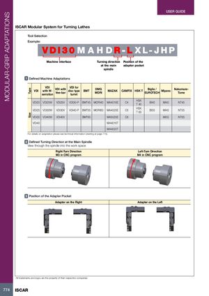 MODULAR-GRIP ADAPTATIONS TypeSize USER GUIDE ISCAR Modular System for Turning Lathes Tool Selection Example: VDI30 M A H DR-L XL-JHP Machine interface Turning direction Position of the at the main adapter pocket spindle 1 Defined Machine Adaptations VDI VDIwith W-serrationVDI withVee-barVDI fordisc typeturretBMTDMGMORIMAZAK CAMFIX HSK T Biglia /EUROTECHMiyanoNakamura-Tome VDI20 VDI25W VDI25V VDI30-P BMT45 MORI40 MA4016E C4 HSKT 40 BI40 MI40 NT45 VDI25 VDI30W VDI30V VDI40-P BMT55 MORI60 MA4020E C5 HSKT 63 BI55 MI45 NT55 VDI30 VDI40W VDI40V BMT65 MA5020E C6 MI55 NT65 VDI40 MA4016T MA4020T For details on adaptation please see technical information (starting at page 775). 2 Defined Turning Direction at the Main Spindle View through the spindle into the work space Right-Turn Direction Left-Turn Direction M3 in CNC program M4 in CNC program 3 Position of the Adapter Pocket Adapter on the Right Adapter on the Left All trademarks and logos are the property of their respective companies 774 ISCAR