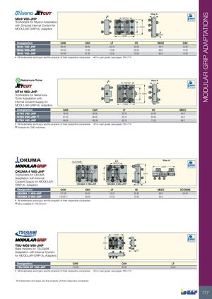 MODULAR-GRIP ADAPTATIONS View A A LF MI## V60-JHP MHD2 150 Bar Max Toolholders for Miyano Adaptation with Directed Internal Coolant for H5 OAH MODULAR-GRIP-XL Adapters OAW DAH Designation OAW OAH LF H5 MHD2 DAH MI40 V60-JHP 89.00 68.00 20.75 52.00 56.0 12.00 MI45 V60-JHP 102.00 72.00 13.95 56.00 68.0 12.00 MI55 V60-JHP 104.00 91.00 15.25 75.00 60.0 12.00 • All trademarks and logos are the property of their respective companies • For user guide, see pages 760-774 Nakamura-Tome A View A MHD2 LF 150 Bar Max NT## V60-JHP Toolholders for Nakamura- H5 OAH Tome Adaptation with Internal Coolant Supply for MODULAR-GRIP-XL Adapters OAW Designation OAW OAH LF H5 MHD2 NT45 V60-JHP 76.50 80.00 20.75 55.00 40.0 NT55 V60-JHP (1) 87.50 86.00 20.75 60.00 50.0 NT65 V60-JHP 99.50 100.00 20.75 71.00 69.0 • All trademarks and logos are the property of their respective companies • For user guide, see pages 760-774 (1) Suitable for CMZ machines DCONMS AMHD2 View A 150 OAW Bar Max OKUMA # V60-JHP Toolholders for OKUMA H5 OAH Adaptation with Internal Coolant Supply for MODULAR- GRIP-XL Adapters OKUMA 1 V60-JHP OKUMA 2 V60-JHP LF Designation OAW OAH LF H5 MHD2 DCONMS OKUMA 1 V60-JHP 107.00 85.00 19.25 65.00 80.0 55.40 OKUMA 2 V60-JHP 110.00 (1) 95.00 24.25 73.00 65.0 - • All trademarks and logos are the property of their respective companies (1) also available in 100.00 mm OAW 150 Bar Max OAH TSU-M08 V60-JHP Base Holders for TSUGAMI LF Adaptation with Internal Coolant for MODULAR-GRIP-XL Adapters Designation OAW OAH LF TSU-M08-SY V60-JHP 110.00 92.00 25.00 • All trademarks and logos are the property of their respective companies • For user guide, see pages 760-774 All trademarks and logos are the property of their respective companies 777