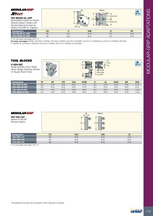 MODULAR-GRIP ADAPTATIONS A View A 150 Bar Max WF (assembly) V## MAHD-XL-JHP H OAW Intermediate Holders for ISCAR Modular System Holders with WF (assembly) Directed Internal Coolant for LF MODULAR-GRIP-XL Adapters Designation CSI H OAW LF WF V60 MAHD-XL-JHP V60 62.0 61.60 6.05 29.50 V85 MAHD-XL-JHP V85 85.0 85.00 6.05 41.30 • For user guide, see pages 760-774 For tools, see pages: CGPAD-JHP (282) • DGPAD-JHP (480) • HGPAD-JHP (267) • PCADR/L-JHP (317) • PCADRS/LS-JHP (317) • TAGPAD-JHP (500) • TAGPAD-XL-JHP (500) • TAGPAD-Y-JHP (519) • TGPAD-JHP (271) • TNFPAD-XL-JHP (569) RADH V-ASH-MCAxially Oriented, Short, Right- OAH HF 80 Bar Max Hand, Wedge Clamping Holders LB WF B for Square Shank Tools RADW BW OAW LPR Designation HF WF LPR OAH RADW B LB RADH BW OAW V60 ASH 20-MC 20.0 31.00 72.00 80.00 51.00 20.0 24.00 40.00 43.00 81.00 V60 ASH 25-MC 25.0 32.00 87.00 90.00 57.00 25.0 24.00 45.00 48.00 87.00 V85 ASH 25-MC 25.0 43.00 87.00 100.00 68.00 25.0 26.00 50.00 55.00 110.50 V85 ASHD 25-MC 25.0 43.00 87.00 100.00 68.00 25.0 26.00 50.00 55.00 110.50 A View A LB V## V##-L## Spacer for ISCAR Modular System OAH OAW Designation CSI OAH OAW LB V60 V60-L15 V60 62.00 64.50 15.00 V60 V60-L30 V60 62.00 64.50 30.00 V85 V85-L30 V85 83.00 85.00 30.00 • For user guide, see pages 760-774 All trademarks and logos are the property of their respective companies 779
