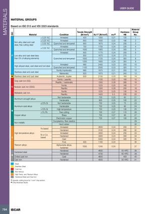 MATERIALS ISO USER GUIDE MATERIAL GROUPS Based on ISO 513 and VDI 3323 standards Material Tensile Strength Hardness Group Material Condition [N/mm2] Kc1(1) [N/mm2] mc(2) HB No. < 0.25 %C Annealed 420 1350 0.21 125 1 ≥ 0.25 %C Annealed 650 1500 0.22 190 2 Non-alloy steel and caststeel, free cutting steel< 0.55 %CQuenched and tempered 850 1675 0.24 250 3 ≥ 0.55 %C Annealed 750 1700 0.24 220 4 Quenched and tempered 1000 1900 0.24 300 5 Annealed 600 1775 0.24 200 6 P Low alloy and cast steel (less 930 1675 0.24 275 7 than 5% of alloying elements) Quenched and tempered 1000 1725 0.24 300 8 1200 1800 0.24 350 9 Annealed 680 2450 0.23 200 10 High alloyed steel, cast steel and tool steel Quenched and tempered 1100 2500 0.23 325 11 Stainless steel and cast steel Ferritic/martensitic 680 1875 0.21 200 12 Martensitic 820 1875 0.21 240 13 M Stainless steel and cast steel Austenitic, duplex 600 2150 0.20 180 14 Gray cast iron (GG) Ferritic / pearlitic 1150 0.20 180 15 Pearlitic / martensitic 1350 0.28 260 16 K Nodular cast iron (GGG) FerriticPearlitic 1225 0.25 160 1713500.2825018 Malleable cast iron FerriticPearlitic 1225 0.25 130 1914200.323020 Not hardenable 700 0.25 60 21 Aluminum-wrought alloys Hardenable 800 0.25 100 22 ≤12% Si Not hardenable 700 0.25 75 23 Aluminum-cast alloys Hardenable 700 0.25 90 24 N >12% Si High temperature>1% PbFree cutting 750 0.25 130 257000.2711026 Copper alloys Brass 700 0.27 90 27 Electrolytic copper 700 0.27 100 28 Non metallic Duroplastics, fiber plasticsHard rubber 2930 Annealed 2600 0.24 200 31 Fe based Hardened 3100 0.24 280 32 High temperature alloys Annealed 3300 0.24 250 33 S Ni or Cobased Hardened 3300 0.24 350 34 Cast 3300 0.24 320 35 Pure 400 1160 0.24 36 Titanium alloys Alpha+beta alloys,hardened 1050 1245 0.24 37 Hardened 4600 55 HRC 38 Hardened steel H Chilled cast iron Hardened 4700 60 HRC 39Cast460040040 Cast iron Hardened 4500 55 HRC 41 Steel Stainless Steel Cast Iron Non-ferrous High Temp. and Titanium Alloys Hardened Steel and Cast Iron (1) Specific cutting force for 1 mm2 chip section. (2) Chip thickness factor. 784 ISCAR