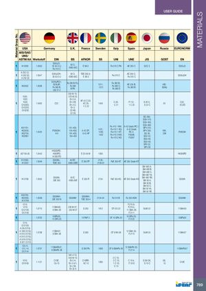 Material Group No. MATERIALS USER GUIDE USA Germany U.K. France Sweden Italy Spain Japan Russia EURONORM AISI/SAE/ UNS/ ASTM/AA Werkstoff DIN BS AFNOR SS UNI UNE JIS GOST EN 1 K12000 1.0553 S355JO;St 52-3 U;Fe 510 C50 C;4360-50CE 36-3 Fe 510 C FN AE 355 C SCC 3 S355JO A 252 (1);1A 252 (2);1.0547A 252 (3)S355JOH; 50 C; TSE 355-3;St 52-3 U4360-50CE 36-3Fe 510 C AE 355 C;Fe 510 C S355JOH 1 K02502 1.0036 S235JRG1;S235JR;Fe 360 B;USt 37-2Fe 360 B FU;Fe 360B FN1311;1312Fe 360 B;Fe 360 C;Fe 360 DAE 235 B;Fe 360 B 16D;St3Kp 055 M 15; 1020; 070 M 20; 1022;11023;G10200;1.0402G10220; C22 En 3 A;En 3 B;En 3 C;En 2;AF 42 C 20;XC 25;1 C 221450C 20;F.112; S 20 C;C 211 C 22S 22 C20 C22;2C/2D G10230 22 HS; 22 CS SG 295; SGV 410; SGV 450; K01701;1K02505;K02704;1.0425K02801P265GH;H ll 151-400;154-400;A 42 CP;161-400;A 42 AP164-4001431;1430;1432Fe 410 1 KW;A 42 Grado RC I;Fe 410 1 KG;A 42 GradoFe 410 1 KT;RC II;Fe 410 2 KW;F.6306;Fe 410 2 KGF.6307SGV 480;SPV 315;SPV 355;SG 30;SGV 42;SGV 46;16K;20KP265GH SGV 49; SPV 32; SPV 36 HX300PD; 1 A27 65-35 1.0443 H300PD; E 23-45 M 1305 HX300PD H 300 PD 1 K12000;K12037 1.0546 S355NL;TStE 355 50 EE;4360-50EEE 355 FP 2135;2135-01FeE 355 KT AE 355 Grado KT SM 490 A; SM 490 B; SM 490 C; SM 490 YA; 1 K12709 1.0545 S355N;StE 355 50 E;4360-50EE 355 R 2134 FeE 355 KG AE 355 Grado KG SM 490 YB;SM 50 A; S355N SM 50 B; SM 50 C; SM 50 YA; SM 50 YB K02705;1K02305; 1.0539K12709 S355NH;StE 335 N S355NH S355NH;TSE 355-42134-04 Fe 510 B Fe 355 KGN S355NH 1213; F.210.A; 1 1215;G12130; 1.0715 11SMn30;9 SMn 28 230 M 07;220 M 07S 250 1912 CF 9 S 22 F.210.L;11 SMn 28;SUM 22 11SMn30 G12150 F.2111 1 1.0722 10SPb20;10 SPb 20 10 PbF 2 CF 10 SPb 20 10 SPb 20;F.2122 10SPb20 1215; G12150; A 29 (1215); 1 A 108 (1215);A 510 (1215);1.073611SMn37;9 SMn 36 S 300 CF 9 Mn 36 12 SMn 35;F.2113 SUM 25 11SMn37 A 510 (1215); A 519 (1215); A 521 (1215) 12L14;112 L 14; 1.0737G12144 11SMnPb37;9 SMnPb 36 S 300 Pb 1926 CF 9 SMnPb 36 12 SMnPb 35;F.2114 11SMnPb37 040 A 10; 045 M 10; 2 C 10; 1 1010;G10100 1.1121 C10E;Ck 10 En 2 A; C10RR;En 2 A/1;XC 101265 2 C 15; C 10 k; S 09 CK;1 C 10;F.1510S 10 C08;10 C10E En 2 B; C 10 En 32 A 789