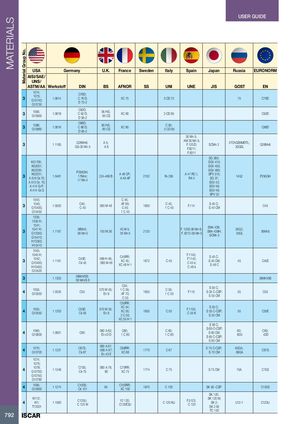 MATERIALS Material Group No. USER GUIDE USA Germany U.K. France Sweden Italy Spain Japan Russia EURONORM AISI/SAE/ UNS/ ASTM/AA Werkstoff DIN BS AFNOR SS UNI UNE JIS GOST EN 1074;31075;G10740;1.0614G10750C76D;C 76 D;D 75-2 XC 75 3 CD 75 75 C76D 3 1095;G10950 1.0618 C92D;C 92 D;D 95-295 HS;95 CSXC 90 3 CD 95 C92D 3 1086;G10860 1.0616 C86D;C 86 D;D 85-280 HS;80 CSXC 80 C 85;3 CD 85 C86D 30 Mn 5; 3 1.1165 G28Mn6; A 5;GS-30 Mn 5A6 AM 30 Mn 5;F.120.D;SCMn 2F.8211;27ChGSNMDTL;30GSL G28Mn6 F.8311 SG 365; K01700; SGV 410; K02001; SGV 450; K02200;3K02201;A 516 Gr.70;1.0481A 515 Gr. 70;P295GH;17Mn4;17 Mn 4224-469 BA 48 CP;A 48 AP2102 SGV 480;Fe 295A 47 RC I;SPV 315;RA IISG 37;SGV 42;14G2P295GH A 414 Gr.F; SGV 46; A 414 Gr.G SGV 49; SPV 32 1043; C 45; 3 1045;G10430; 1.0503 C45;C 45 080 M 46 AF 65;C 45; 1650 C 45;1 C 45 F.114 S 45 C;S 45 CM C45 G10450 1 C 45 1335; 1335 H; 1541;31541 H;G13350;1.1167 36Mn5;36 Mn 5 150 M 36 40 M 5;35 Mn 5 2120G15410; F. 1203-36 Mn 6;F. 8212-36 Mn 5SMn 438;SMn 438H;SCMn 335G2;35GL36Mn5 H13350; H15410 1045; 1045 H;31042;G10450;1.1191H10450;C45E;Ck 45 089 H 46;080 M 46C45RR;XC 45;XC 48 H 11672C 45 F.1140;F.1142;C 45 k;C 48 kS 45 C;S 45 CM;S 48 C45C45E G10420 3 1.1303 38MnVS6;38 MnVS 6 38MnVS6 4 1055;G10550 1.0535 C55 C54;070 M 55;1 C 55;En 9AF 70;1655C 55C 55;1 C 55 S 55 C;F.115S 55 C-CSP;S 55 CM55 C55 C50RR; 4 1055;G10550 1.1203 C55E;Ck 55 070 M 55;En 9 XC 54;XC 50;2 C 55;1655 C 55 F.1150;C 55 K S 55 C;S 55 C-CSP;S 55 CM55 C55E XC 55 H 1 S 58 C; 4 1060;G10600 1.0601 C60 060 A 62; C60;En 43 D1 C 60 C 60;1 C 60 S 60-C-CSP;S 60 CM;S 65 C-CSP;60;60GC60;43D S 65 CM 4 1070;G10700 1.1231 C67S;Ck 67 060 A 67;080 A 67;En 43 EC68RR;XC 681770 C 67 S 70 C-CSP; 65GA;S 70 CM68GAC67S 1074; 1075; 4 1078;G10700; 1.1248 C75S;Ck 75 060 A 78; C75RR;80XC 75 1774 C 75 S 75 CM 75A C75S G10750; G10780 4 1095;G10950 1.1274 C100S;Ck 101 95 C100RR;XC 100 1870 C 100 SK 95 -CSP C100S SK 120; W112;4W1; 1.1563T72301 C125U;C 125 W Y2 120;C120E3U C 120 KU F.5123;C 120 SK 120 M;SK 2;SK 2 M;U12-1 C125U TC 120 792 ISCAR