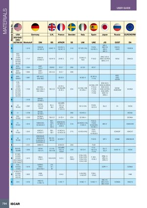 MATERIALS Material Group No. USER GUIDE USA Germany U.K. France Sweden Italy Spain Japan Russia EURONORM AISI/SAE/ UNS/ ASTM/AA Werkstoff DIN BS AFNOR SS UNI UNE JIS GOST EN SKS 2; 6 1.2419 105WCr6;105 WCr 6105WC 13 105 WCr 5;105 WC 132140 107 WCr 5 KU F.5233;105 WCr 5SKS 2 M;SKS 3; ChW1G;ChWG 105WCr6 SKS 31 4820; 5120;65120H;G48200;1.7147G51200;20MnCr5;20 MnCr 5150 M 19 20 MC 5 2172 20 MnCr 5;Fe52 SMnC 420 H;F.150.DSMnC 420 RCH;SMnC 21 H18ChG20MnCr5 H51200 6 9255;G92550 1.0904 55Si7;55 Si 7 250A53 55 S 7 2085 55 Si 8 56 Si 7 6 9254;G92550 1.0904 55Si7;55 Si 7 250 A 53 55 S 7 2090 6 9262;G95620 1.0961 HDT 450 F;S340 MGC 60 SC 6 60 SiCr 8 60 SiCr 8;F.1442 60S2;55S2;50ChFA 4135;4137;4135H;64137H;G41350;1.7220G41370;H41350;H41370 SCM 435 H;34CrMo4;GS34 CrMo 4;G34 CrMo 434 CD 4;708 A 3034CrMo4RR;35 CD 4;223435 CrMo 4 DF;SCM 435 HRCH;34 CrMo 4 KB;35 CrMo 4F.125.A;F.125.B;F.1254;SCM 435 M;SCM 435 RCH;SCM 435TK;35ChM;AS38ChGMF.1250SCM 3 H;STKS 334CrMo4 6 1.5120 38MnSi4;38 MnSi 4 6 L3;T61203 1.2067 102Cr6;102 Cr 6;100Cr6 100Cr6RR;BL 3;100 C 6;BL3100Cr6;Y 100 C 6102 Cr 6 KUF.5230;100 Cr 6SUJ 2 Ch 102Cr6 6 L1 1.2108 90CrSi5;90 CrSi 5 2092 105 WCr 5 90CrSi5 6 P20;T51620 1.2330 35CrMo4;35 CrMo 4708 A 37 34 CD 4 2234 35 CrMo 4 35CrMo4 6 O1;T31501 1.2510 100MnCrW4;100 MnCrW 4BO1;BO0;BO 1;BO 090MnWCrV5;90 MWCV 5;8 MO 8 F.522.A;214095 MnWCr 5 KU;F.5220;10 WCr 695 MnCrW5;105 WCr 5SKS 31100MnCrW4 6 S1;T41901 1.2542 45WCrV7;45 WCrV 7 BS1; 45 WCrV 8;BS 145 WCrV 202710 F.524;45 WCrV 8 KUF.5241;45 WCrSi 85ChW25F 45WCrV7 55NiCrMoV6; 6 L6;T61206 1.2713 56NiCrMoV6;55 NiCrMoV 6;BH 224;BH 22555 NCDV 7 F.520.S SKT 4 5ChNM 55NiCrMoV6 56 NiCrMoV 6 6 1.2721 50NiCr13 55 NCV 6 2550 F.528 6 E52100;G52986 1.3505 100Cr6;100 Cr 6 2 S.135;535 A 99100Cr6RR;100 C 6;100Cr62258 F.131;100 Cr 6100 Cr 6;F.1310SUJ 2;SUJ 4SchCh 15100Cr6 K11820;K12020;6K12320;1.5415A204 Grade A;A182 Grade F116Mo3;15 Mo 31503-243 B15 D 3 16 Mo 3 KG;2912;16 Mo 3 KW;F. 2601;16Mo316 Mo 5 KG;16 Mo 316 Mo 5 KWSTBA 12;STFA 12;STPA 12 4422; G20Mo5; 245; 6 G44220; 1.5419 20Mo4; B 1; SCPH 11 G20Mo5 J12522 GS-22 Mo 4 B1 A 350-LF 5; 6 K13050;K21703; 1.5622 14Ni6;14 Ni 6 16 N 6 14 Ni 6 KG; F.2641;14 Ni 6 KT15 Ni 6 14Ni6 K22103 6 3415 1.5732 14NiCr10;14 NiCr 10 14 NC 11 SNC 415;16 NiCr 1115 NiCr 11SNC 415 H;12ChN3A14NiCr10SNC 415 M 794 ISCAR