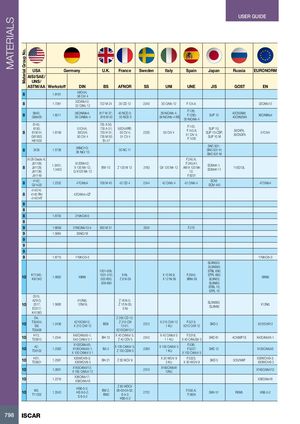 MATERIALS Material Group No. USER GUIDE USA Germany U.K. France Sweden Italy Spain Japan Russia EURONORM AISI/SAE/ UNS/ ASTM/AA Werkstoff DIN BS AFNOR SS UNI UNE JIS GOST EN 8 1.8161 58CrV4;58 CrV 4 8 1.7361 32CrMo12;32 CrMo 12722 M 24 30 CD 12 2240 30 CrMo 12 F.124.A 32CrMo12 8 9840;G98400 1.6511 36CrNiMo4; 817 M 37; 40 NCD 3;36 CrNiMo 4816 M 4035 NCD 539 NiCrMo 4;39 NiCrMo 4 KBF.128;F.1280;35 NiCrMo 4SUP 1040ChGNM;40ChN2MA36CrNiMo4 6145;6150;86150 H;1.8159G61500;H61500 735 A 50;51CrV4;735 A 51;50CrV4RR;50CrV4;735 H 51;50 CV 4;223050 CrV 4735 M 50;51 CV 4En 4750 CrV 4F.143;F.143.A;51 CrV 4;F.1430SUP 10;SUP 10-CSP;SUP 10 M50ChFA;50ChGFA51CrV4 8 3435 1.5736 36NiCr10;36 NiCr 10 30 NC 11 SNC 631;SNC 631 H;SNC 631 M A128 Grade A; F.240.A; J91109;8J91129;J91139;1.3401;1.3403X120Mn12;X 120 Mn 12;BW 10Z 120 M 12G-X120 Mn 122183 F.240.A1;GX 120 Mn 12AM-X 120 Mn12;SCMnH 1;SCMnH 11110G13L J91149 F.8251 8 4142;G41420 1.2332 47CrMo4 708 M 40 42 CD 4 2244 42 CrMo 4 42 CrMo 4 SCM;SCM 440 47CrMo4 4140 H; 8 4140 RH; 42CrMo4+QT 4140 HT 8 8 8 1.8705 21MnCr6-5 8 9 1.6659 31NiCrMo13-4 830 M 31 2534 F.270 9 1.5864 35NiCr18 9 9 9 9 1.8715 17MnCr5-3 17MnCr5-3 SL9N520; SL9N590; 1501-509; STBL 690; 10 K71340;K81340 1.5662 X8Ni9 1501-510; 9 Ni;502-650;Z 8 N 09 X 10 Ni 9; F.2645; STPL 690;X 12 Ni 09XBNi 09SL9N53;X8Ni9 509-690 SL9N60; STBL 70; STPL 70 2515; A2515; X12Ni5; Z 18 N 5;102517;1.568012Ni19;Z 10 N 05;E2517;5 Ni SL5N590;SL5N60 X12Ni5 K41583 D4; Z 200 CD 12; 10 T30404;D6; 1.2436 X210CrW12;X 210 CrW 12BD6 Z 210 CW12-01; 2312 X 215 CrW 12 F.5213;1 KUX210 CrW 12SKD 2 X210CrW12 T30406 X210CrW12-1 10 H13;T20813 1.2344 X40CrMoV5-1;X40 CrMoV 5 1BH 13X 40 CrMoV 5;Z 40 CDV 52242 X 40 CrMoV 5 F.5318;1 1 KUX 40 CrMoSiV 5SKD 614Ch5MF1S X40CrMoV5-1 10 A2;T30102 1.2363 X100CrMoV5;X100CrMoV5-1;X 100 CrMoV 5 1BA 2X 100 CrMoV 5;Z 100 CDW 52260X 100 CrMoV 51 KUF.536;F.5227;X 100 CrMoV 5SKD 12X100CrMoV5 10 H21;T20821 1.2581 X30WCrV9-3;X30WCrV9 3BH 21 Z 30 WCV 9 X 30 WCrV 9 F.5323;3 KUX 30 WCrV 9SKD 5 3Ch2W8F X30WCrV9-3;X30WCrV9 3 10 1.2601 X165CrMoV12;X 165 CrMoV 12 2310 X165CrMoW12KU X165CrMoV12 10 1.2316 X36CrMo17;X38CrMo16 X38CrMo16 10 M2;T11302 1.3343 HS6-5-2;HS 6-5-2;S 6-5-2 Z 85 WDCVBM 2;06-05-04-02;BM26-5-2;2722HS6-5-2F.550.A;F.5604 SKH 51 R6M5 HS6-5-2 798 ISCAR