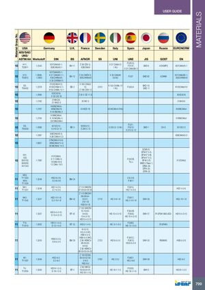 Material Group No. MATERIALS USER GUIDE USA Germany U.K. France Sweden Italy Spain Japan Russia EURONORM AISI/SAE/ UNS/ ASTM/AA Werkstoff DIN BS AFNOR SS UNI UNE JIS GOST EN 10 H11;T20811 1.2343 X37CrMoV5-1;X38CrMoV5-1BH 11 Z 38 CDV 5;X38CrMoV X 37 CrMoV 51 KU F.520.G;F.5137;X 37 CrMoSiV 5SKD 64Ch5MFS X37CrMoV5-1 X37CrMoW5-1; 10 H12;T20812 1.2606;1.2605X 37 CrMoW 5 1;X35CrWMoV5;BH 12Z 35 CWDV 5;X35CrWMoV5 X 35 CrMoW05 KU F.537 SKD 62 5ChNM X37CrMoW5-1;X35CrWMoV5 X 35 CrWMoV 5 10 D2;T30402 1.2379 X153CrMoV12;X155CrVMo12-1;X155 CrVMo 12 1X 160 CrMoVBD 212;Z 160 CDV 122310X 155 CrVMo 121 KUF.520.ASKD 10;SKD 11 X153CrMoV12 10 1.2085 X33CrS16;X 33 CrS 16 Z 35 V CD 17.S X33CrS16 10 1.2162 21MnCr5;21 MnCr 5 20 MC 5 21MnCr5 X45NiCrMo4; 10 1.2767 45NiCrMo16; 45 NCD 16 40 NiCrMoV 8 KU X45NiCrMo4 X 45 NiCrMo 4 X19NiCrMo4; 10 1.2764 X 19 NiCrMo 4; X19NiCrMo4 GX19NiCrMo4 10 D3;T30403 1.2080 X210Cr12;X 210 Cr 12BD 3 X200Cr12;Z 200 C 12 F.521;X 205 Cr 12 KUF.5212;SKD 1 Ch12 X210Cr12X 210 Cr 12 10 1.2367 X38CrMoV5-3;X 38 CrMoV 5 3 X38CrMoV5-3 27NiCrMoV15-6; 10 1.6957 26NiCrMoV14-5; 26 NiCrMoV 14 5 SCMV 6; SFVA F 5 A; 501;502;10S50100;1.7362S50200;K41545X12CrMo5;X 11 CrMo 5;12CrMo19-5;12 CrMo 19 5 SFVA F 5 B;F.240.B;TU.JSFVA F 5 C;SFVA 5 D;SNB 5 Class 1;X12CrMo5STBA 29; STFA 25; STPA 25 M33; 11 T11333;M34; 1.3249 HS2-9-2-8;S 2-9-2-8BM 34 2-9-2-8;F.5611 T11334 11 M41;T11341 1.3246 HS7-4-2-5;S 7-4-2-5 Z 110 WKCDV07-05-04-04-02 F.5615;HS 7-4-2-5 HS7-4-2-5 Z 110 DKCWV 11 M42;T11342 1.3247 HS2-10-1-8;S 2-10-1-8 09-08-04-BM 4202-01;2-9-1-8;2716HS 2-9-1-8 F.5617;HS 2-10-1-8SKH 59 HS2-10-1-8 HS2-9-1-8 Z 130 WKCDV 11 1.3207 HS10-4-3-10;S 10-4-3-10 10-10-04-BT 4204-03;10-4-3-10; F.550.B;HS 10-4-3-10F.5553;SKH 57R12F3K10M3-SChHS10-4-3-10HS 10-4-3-10 HS10-4-3-10 11 T15;T12015 1.3202 HS12-1-4-5;S 12-1-4-5BT 15 HS12-1-4-5 HS 12-1-5-5 F.5563;HS 12-1-5-5 R13F4K5 6-5-2-5; 6-5-2-5 HC; HS6-5-2-5; 11 1.3243 HS6-5-2-5;S 6-5-2-5 HS6-5-2-5HC;BM 35Z 85 WDKCV272306-05-05- F.550.C;HS 6-5-2-5F.5613;SKH 55HS 6-5-2-5R6M5K5HS6-5-2-5 04-02; Z 90 WDKCV 06-05-05-04-02 Z 100 DCWV 11 M7;T11307 1.3348 HS2-9-2;S 2-9-2 09-04-02-02;2-9-2;2782 HS 2 9 2 F.5607;HS 2-9-2 SKH 58 HS2-9-2 HS2-9-2 11 T4;T12004 1.3255 HS18-1-2-5;S 18-1-2-5 Z 80 WKCVBT 419-05-04-01;HS 18-1-1-5HS 18-1-1-5F.5530;HS 18-1-1-5SKH 3 HS18-1-2-5 799