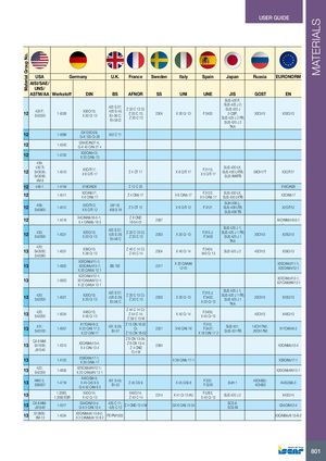Material Group No. MATERIALS USER GUIDE USA Germany U.K. France Sweden Italy Spain Japan Russia EURONORM AISI/SAE/ UNS/ ASTM/AA Werkstoff DIN BS AFNOR SS UNI UNE JIS GOST EN SUS 420 F; 12 420 F;S42020 1.4028 X30Cr13;X 30 Cr 13420 S 37;420 S 45;En 56 C;En 56 DZ 33 C 13 Cl;Z 33 C 13;Z 30 C 132304 SUS 420 J 2;SUS 420 JX 30 Cr 13F.34032-CSP;30Ch13SUS 420 J 2 FB;SUS 420 J 2X30Cr13 TKA 12 1.4086 GX120Cr29;G-X 120 Cr 29452 C 11 12 1.4340 GX40CrNi27-4;G-X 40 CrNi 27 4 12 1.4720 X20CrMo13;X 20 CrMo 13 439; 430 Ti;12S43035;1.4510S43036;X3CrTi17;X 6 CrTi 17 Z 4 CT 17 X 6 CrTi 17 F.3115;X 5 CrTi 17SUS 430 LX;SUS 430 LXTB;SUS XM8TB08Ch17TX3CrTi17 XM 8 12 446-1 1.4749 X18CrN28 Z 12 C 25 X18CrN28 12 1.4511 X3CrNb17;X 6 CrNb 17 Z 4 CNb 17 X 6 CrNb 17 F.3122; SUS 430 LX;X 5 CrNb 17SUS 430 LXTB X3CrNb17 12 409;S40900 1.4512 X2CrTi12;X 6 CrTi 12LW 19;409 S 19Z 3 CT 12 SUH 409 L;X 6 CrTi 12F.3121SUS 409 LTB;SUS 409 TBX2CrTi12 12 1.4418 X4CrNiMo16-5-1;X 4 CrNiMo 16 5 Z 6 CND16-04-01 2387 X4CrNiMo16-5-1 12 420;S42000 1.4021 X20Cr13;X 20 Cr 13420 S 37;420 S 29;En 56 CZ 20 C 13 CI;Z 20 C 132303 SUS 420 J 1;X 20 Cr 13F.310.J;SUS 420 J 1 FB;F.3402SUS 420 J 120Ch13TKAX20Cr13 420;13S42000;1.4031S42080 X39Cr13;X 38 Cr 13 Z 40 C 14 CI;Z 40 C 142304 X 40 Cr 14 F.3404;X40 Cr 13SUS 420 J 2 40Ch13 X39Cr13 X20CrMoV11-1;131.4922X20CrMoV12-1;BS 762X 20 CrMoV 12 12317 X 20 CrMoNi12 01 X20CrMoV11-1;X20CrMoV12-1 X22CrMoV12-1;131.4923X21CrMoNiV12-1;X 22 CrMoV 12 1 X22CrMoV12-1;X21CrMoNiV12-1 13 420;S42000 1.4021 X20Cr13;X 20 Cr 13420 S 37;420 S 29;En 56 CZ 20 C 13 CI;Z 20 C 132303X 20 Cr 13F.310.J;F.3402;X 20 Cr 13SUS 420 J 1;SUS 420 J 1 FB;SUS 420 J 1TKA20Ch13X20Cr13 13 420;S42000 1.4034 X46Cr13;X 46 Cr 13 Z 44 C 14 CI;Z 44 C 14;Z 38 C 13 MX 40 Cr 14 F.3405;X 40 Cr 13 40Ch13 X46Cr13 13 431;S43100 1.4057 X17CrNi16-2;X 20 CrNi 17 2;X 22 CrNi 17431 S 29;En 57Z 15 CN 16.02CI;Z 15 CN 16-022321X16 CrNi 16F.313;F.3427;X 19 CrNi 17 2SUS 431;SUS 431 FB14Ch17N2;20Ch17N2X17CrNi16-2 CA 6-NM;13S41500;1.4313J91540X3CrNiMo13-4;X 4 CrNi 13 4 Z 6 CN 13-04;Z 6 CN 13-4;Z 4 CND238413.4 M X3CrNiMo13-4 13 1.4122 X39CrMo17-1;X 35 CrMo 17 X 39 CrMo 17-1 X39CrMo17-1 13 422;S42200 1.4935 X20CrMoWV12-1;X 20 CrMoWV 12 1 X20CrMoWV12-1 13 HNV 3;S65007 1.4718 X45CrSi9-3;X 45 CrS 9 3;G-X 45 CrNi 9 3401 S 45;En 52Z 45 CS 9X 45 CrSi 8 F.322;F.3220 SUH 1 40Ch9S2;4Ch9S2 X45CrSi9-3 13 1.2083; X40Cr14;1.2083 ESRX 42 Cr 13 X40Cr14;Z 40 C 14 2314 X 41 Cr 13 KU F.5263;X 40 Cr 13SUS 420 J 2 X40Cr14 13 CA 6-NM;J91540 1.4317 GX4CrNi13-4;G-X 5 CrNi 13 4425 C 11;425 C 12Z 4 CND 13 4 M GX 6 CrNi 13 04 SCS 6;SCS 6X GX4CrNi13-4 13 S13800;XM-13 1.4534 X3CrNiMoAl 13-8-2;X 3 CrNiMoAl 13 8 2FE-PM1503 X3CrNiMoAl 13-8-2 801