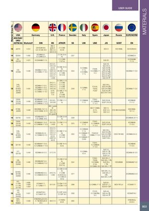 Material Group No. MATERIALS USER GUIDE USA Germany U.K. France Sweden Italy Spain Japan Russia EURONORM AISI/SAE/ UNS/ ASTM/AA Werkstoff DIN BS AFNOR SS UNI UNE JIS GOST EN ANC 3 14 J92701 1.4312 GX10CrNi18-8; grade A; Z 10 CNDG-X 10 CrNi 18 8ANC 3 A;18.9 M SCS 12 10Ch18N9L GX10CrNi18-8 3025 S 25 14 S32304 1.4362 X2CrNiN23-4;X 2 CrNiN 23 4 Z 3 CN 23-04Az 2327 X2CrNiN23-4 14 201;S20100 1.4372 X12CrMnNiN17-7-5 Z 12 CMN17-07 Az SUS 201 X12CrMnNiN17-7-5 316 S 31; SUS 316; 14 316;S31600 1.4436 X3CrNiMo17-13-3;X 5 CrNiMo 17 13 3316 S 33;LW 23;LWCF 23;316 S 19;316 S 40;316 S 41;Z 6 CND 18-12-03;Z6 CND 18-13;Z 7 CND18-12-032343SUS 316 A;X 5 CrNiMo17 13;X 8 CrNiMo17 13F.3538;X 5 CrNiMo 1713 3SUS 316 FB;SUS 316 TB;SUS 316 TBS;SUS 316 TKA;SUS 316 TKC;X3CrNiMo17-13-3 1.4436 SUS 316 TP Z 2 CND 17-12; 316 S 11; Z 3 CND 316L;316 L;14S31603;J92700;J928001.4404X2CrNiMo17-12-2;X2CrNiMo17-13-2;X 2 CrNiMo 17 12 2;X 2 CrNiMo 17 13 2316 S 13;17-11-02;316 S 14;Z 3 CND316 S 30;17-12-02;S.161;Z 3 CND 17-12-S.537;02 FF;2348SUS 316 L;X 2 CrNiMo17 12F.310.K;SUS 316 LFB;F.3533;SUS 316 LTBS;F.3537SUS 316 LTP;SUS 316 F 316 LX2CrNiMo17-13-2 T.75 Z 3 CND 18-12-03 316LN;14316 LN;S316531.4406X2CrNiMoN17-11-2;X2CrNiMoN17-12-2;X 2 CrNiMoN 17 12 2316 S 61;316 S 63Z 2 CND 17-11AzX 2 CrNiMoN17 12F.3542;X 2 CrNiMoN17 12 2SUS 316 LN;SUS F 316 LNX2CrNiMoN17-11-2 ANC 4 grade 14 CF-8M;J92900 1.4408 GX5CrNiMo 19-11-2;G-X 6 CrNiMo 18 10B;ANC 4 B;316 C 16; AM-X 7 CrNiMo20 10;F.8414SCS 14;SCS 14 A;SCS 14 X07Ch18N10G2S2M2LGX5CrNiMo19-11-2 845 grade B 14 S32750 1.4410 X2CrNiMoN25-7-4;X 10 CrNiMo 18 9 Z 5 CND 25-06Az 2328 X2CrNiMoN 25-7-4 316LN;14316 LN;S315631.4429X2CrNiMoN17-13-3; 316 S 63; Z 3 CND 17-12X 2 CrNiMoN 17 13 31.4429Az2375X 2 CrNiMoN17 13F.3543;X 2 CrNiMoN17 13 3SUS 316 LN;SUS F 316 LNX2CrNiMoN17-13-3 316L;14316 L;S31603;J928001.4435 316 S 13;X2CrNiMo18-4-3;X 2 CrNiMo18 14 3316 S 11;316 S 14;316 S 31;LW 22;LWCF 22;Z 3 CND 17-12-03;Z 3 CND18-14-032353845 BX 2 CrNiMoN17 13;X 2 CrNiMoN 17F.3533-X213 KG;CrNiMo 17 13 2X 2 CrNiMoN 1713 KWSUS 316 L;SUS 316 LFB;SUS 316 LTBS;SUS 316 LTP;SUS F 316 LO3Ch17N14M3X2CrNiMo18-4-3 14 S31726 1.4439 X2CrNiMoN17-13-5;X 2 CrNiMoN 17 13 5Z 3 CND 18-14-05 Az F.3544;X 2 CrNiMoN17 13 5 X2CrNiMoN17-13-5 SUS 317; 14 317;S31700 1.4449 X3CrNiMo18-12-3 317 S 16 X 5 CrNiMo SUS 317 TB;18 15SUS 317 TP; X3CrNiMo18-12-3 SUS F 317 329;14S31260;S329001.4460X3CrNiMoN27-5-2;X 4 CrNiMoN 27 5 2Z 5 CND 27-05Az;Z 3 CND232425-07 Az F.3552; SUS 329 J 1;F.3309;SUS 329 J 1 FB;X 8 CrNiMoSUS 329 J10Ch26N5MX3CrNiMoN27-5-227-05;1 TB;X 8 CrNiMo 26 6SUS 329 J 1 TP Z 2 CND 24-08 S31803;14S31260;S32900 Az;1.4462X2CrNiMoN22-5-3;318 S 13;Z 3 CNDX 2 CrNiMoN 22 5 31.446225-06-03 Az;Z 3 CND 252377SUS 329 J 3 L;SUS 329 J 3LTB;X2CrNiMoN22-5-3SUS 329 J 3 LTP -05 Az 631;1417-7PH;17-7 PH;S177001.4568;1.4564;1.4504X7CrNiAl17-7;X 7 CrNiAl 17 7301 S 81Z 9 CNA 17-07;Z 8 CNA 17-072388 SUS 631;X 2 CrNiMo 17 12SUS 631 J 1;09Ch17N7Ju1X7CrNiAl17-7SUS 631-CSP 443;14444;S44300;1.4521 X2CrMoTi18-2;X 2 CrMoTi 18 2 Z 3 CDT 18-02;Z 3 CDT 18-22326S44400 F.3123; SUS 444;X 2 CrMoTiNbSUS 444 TB;18 2SUS 444 TPX2CrMoTi18-2 904L;14904 L;N089041.4539X1NiCrMoCu25-20-5;X 1 NiCrMoCuN 25904 S 1320 5Z 2 NCDU25-202562 X1NiCrMoCu25-20-5 803