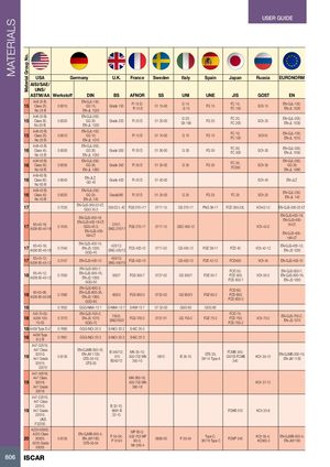 MATERIALS Material Group No. USER GUIDE USA Germany U.K. France Sweden Italy Spain Japan Russia EURONORM AISI/SAE/ UNS/ ASTM/AA Werkstoff DIN BS AFNOR SS UNI UNE JIS GOST EN A48 25 B;15Class 25;0.6015No 25 BEN-GJL-150;GG 15;EN-JL 1020Grade 150Ft 15 D;R 15 D01 15-00G 14;G 15 FG 15 FC 15;FC 150 SCh 15 EN-GJL-150;EN-JL 1020 A48-30 B;15Class 30,0.6020No.30 BEN-GJL-200;GG 20;Grade 220 Ft 20 D 01 20-00EN-JL 1030G 20;Gh 190 FG 20 FC 20;FC 200 SCh 20 EN-GJL-200;EN-JL 1030 A48-20 B; EN-GJL-100;15Class 20;0.6010GG 10;No 20 BEN-JL 1010Ft 10 D01 10-00G 10 FG 10 FC 10;FC 100 SCh10 EN-GJL-100;EN-JL 1010 A48-45 B; EN-GJL-300;16Class 45;0.6030GG 30;Grade 300Ft 30 D01 30-00 G 30No 45 BEN-JL 1050FG 30 FC 30;FC 300 SCh 30 EN-GJL-300;EN-JL 1050 A48-50 B; EN-GJL-350;16Class 50;0.6035GG 35;Grade 350Ft 35 D01 35-00 G 35No 50 BEN-JL 1060FG 35 FC 35;FC350 EN-GJL-350;SCh 35GG 35;EN-JL 1060 A48-60 B;16Class 60;0.6040No 60 BEN-JLZ;GG 40 Grade 400 Ft 40 D 01 40-00 SCh 40 EN-JLZ A48-40 B; EN-GJL-250;16Class 40;0.6025GG 25;Grade260Ft 25 D01 25-00 G 25 FG 25 FC 25No 40 BEN-JL 140SCh 25 EN-GJL-250;EN-JL 140 17 0.7033 EN-GJS-350-22-LT;GGG 35.3350/22 L 40FGS 370-/17 0717-15 GS 370-17 FNG 38-17 FCD 350-22L VCh42-12 EN-GJS-350-22-LT EN-GJS-400-18;17 60-40-18; A536 60-40-180.7043EN-GJS-400-18-LT;GGG-40.3;EN-GJS-400-370/7;SNG 370/17FGS 370-170717-15GSO 400-1218A-LTEN-GJS-400-18;EN-GJS-400-VCh 42-218-LT;EN-GJS-400-18A-LT 17 60-40-18; A536 60-40-18 0.7040 EN-GJS-400-15;EN-JS 1030;GGG-40420/12;SNG 420/12FCS 400-120717-02GS 400-12 FGE 38-17 FCD 40 VCh 42-12 EN-GJS-400-15;EN-JS 1030 17 65-45-12; A536 65-45-12 5.3107 EN-GJS-450-10 450/10;SNG 450/10FGS 450-10 GS 400-12 FGE 42-12 FCD450 VCh 45 EN-GJS-450-10 18 65-45-12; A536 65-45-12 0.7050 EN-GJS-500-7;EN-GJS-500-7A;EN-JS 1050;500/7FGS 500-70727-02GGG-50 FCD 50;GS 500/7FGE 50-7FCD 500;FCD 500-7EN-GJS-500-7;VCh 50-2EN-GJS-500-7A;EN-JS 1050 18 80-55-06; A536 80-55-06 0.7060 EN-GJS-600-3;EN-GJS-600-3A;EN-JS 1060;600/3FGS 600-30732-03GGG-60 FCD 60;GS 600/3FGE 60-2FCD 600;FCD 600-3 18 0.7652 GGG-NiMn 13 7 S-NiMn 13 7 S-NM 13 7 07 32-03 GGG 60 GGG 60 100-70-03;18A536 100-0.707070-03EN-GJS-700-2;EN-JS 1070;GGG-70700/2;SNG700/2FGS 700-20737-01 FCD 70;GS 700-2FGE 70-2FCD 700;FCD 700-2VCh 70-2EN-GJS-700-2;EN-JS 1070 18 A439 Type D-2 0.7660 GGG-NiCr 20 2 S-NiCr 20 2 S-NC 20-2 18 A439 TypeD-2 B 0.7661 GGG-NiCr 20 3 S-NiCr 20 3 S-NC 20 3 A47-32510; A47 Class1932510;A47 Grade0.813532510;EN-GJMB-350-10;EN-JM 1130;GTS-35-10;GTS-35B 340/12;MN 35-10;310A32-702 MNB340/12350-100810B 35-10GTS 35;36114 Type AFCMB 340;G5703 FCMB340KCh 35-10EN-GJMB-350-10;EN-JM 1130 32510 A47-35018, A47 Class MN 380-18; 19 35018; A32-702 MN KCh 37-12 A47 Grade 380-18 35018 A47-22010; A47 Class 22010; B 32-10; 19 A47 Grade 6681 B FCMB 310 KCh 33-8 22010; 32-10 UNS F22200 A220-50005;A220 Class2050005;0.8155A220 Grade50005EN-GJMB-550-4;EN-JM1160;GTS-55-04MP 60-3;P 55-04;A32-703 MPP 510/460-3;Mn 550-40856-00P 55-04Type C;36116 Type CFCMP 540KCh 55-4;EN-GJMB-550-4;KCh60-3EN-JM1160 806 ISCAR