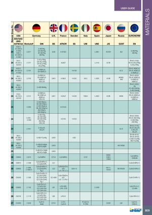 Material Group No. MATERIALS USER GUIDE USA Germany U.K. France Sweden Italy Spain Japan Russia EURONORM AISI/SAE/ UNS/ ASTM/AA Werkstoff DIN BS AFNOR SS UNI UNE JIS GOST EN A356.0; AA A356.0; G-AlSi7Mg; 24 A13560;A356.2;3.2371 GK-AlSi7Mg;GF-AlSi7Mg;2L99 A-S7G03 L-2651 AC4CH AL9 G-AlSi7Mg;AlSi7Mg AA A356.2; AlSi7Mg A13562 204.0;24AA 204.0;3.1371A02040G-AlCu4TiMg;GK-AlCu4TiMg;GF-AlCu4TiMg;AlCu4TiMgAU5GT EN AC-21000;L-2140AC1BEN AC-AlCu4TiMg;G-AlCu4TiMg A333.0;24AA A333.0;3.2161A13330G-AlSi8Cu3;GK-AlSi8Cu3 144163 EN AC-AlSi8Cu3;AL13EN AC-AlSi8Cu3;G-AlSi8Cu3 380.0;24AA 380.0;3.2163A03800G-AlSi9Cu3;GD-AlSi9Cu3;AlSi9Cu3;LM24A-S9U3 144252VDS 226 3610 L-2630 AC4B EN AC-46200;AK8M3;EN AC-AlSi8Cu3;AK8G-AlSi9Cu3;AlSi8Cu3 365.0;24AA 365.0; G-AlSi10MnMgA03650 EN AC-43500;ENAC-AlSi10MnMg;G-AlSi10MnMg 319.0;24AA 319.0;3.2151A03190G-AlSi6Cu4;GK-AlSi6Cu4;AlSi6Cu4;LM21A-S5UZ 144230VDS 225 7369/4 L-2620 AC2B EN AC-45000;AK5MEN AC-AlSi6Cu4;G-AlSi6Cu4;AlSi6Cu4 G-AlSi10MgCu; GK-AlSi10MgCu; 24 3.2383 G-AlSi10Mg(Cu);GK-AlSi10Mg(Cu);A-S10UG AlSi10MgCu; AlSi10Mg(Cu) G-AlSi10Mg;243.2381;3.2385GK-AlSi10Mg;GD-AlSi10Mg;AlSi10Mg;A-S10G144253VDS 239 EN AC-43000;EN AC-AlSi10Mg;G-AlSi10Mg;AlSi10Mg EN AC-21100; 24 3.1841 G-AlCu4Ti;AlCu4Ti AL19 EN AC-AlCu4Ti;G-AlCu4Ti; AlCu4Ti 390.0;25AA 390.0; G-AlSi17Cu4Mg LM30 4282A03900 EN AB-48100;EN AC-48100;G-AlSi17Cu4Mg;AlSi17Cu4Mg 393.0;25AA 393.0;A03930 G-AlSi20CuMgNi;AlSi20CuMgNiLM29 AK21M2N2 25 G-AlSi18Cu1MgNi;AlSi18Cu1MgNiLM28 C3600;26C360002.0375CuZn36Pb3CZ124CuZn36Pb312167C3601;C3602CuZn36Pb3;CW603N 26 C83810 2.1098 CuSn3Zn8Pb5-C;G-CuSn2ZnPbLG1 CuSn3Zn8Pb5-C 26 C83600 2.1096;2.1096.01CuSn5Zn5Pb5-C;G-CuSn5ZnPb;Rg 5CuPb5Sn5Zn5;LG2UE5;5204-15U-E 5 Pb 5 Z 5 H5111;H2203 BrO5Ts5S5 CuSn5Zn5Pb5-C CuSn7Zn4Pb7-C; G-CuSn7ZnPb; CuSn7Pb6Zn4; 26 C93200 2.1090 GC-CuSn7ZnPb; GC 493K UE7; CuSn7Zn4Pb7-C GZ-CuSn7ZnPb; U-E 7 Z 5 Pb 4 Rg 7 CuSn7Pb15-C; 26 C93800 2.1182 G-CuPb15Sn;GC-CuPb15Sn;LB1 U-Pb15E8;U-Pb 15 E8 C-3300 CuSn7Pb15-C;CC496K GZ-CuPb15Sn CuSn10Pb10-C; 26 C93700 2.1176 G-CuPb10Sn;GC-CuPb10Sn;LB2 U-Pb10 CuSn10Pb10-C GZ-CuPb10Sn 27 C22000 2.0230 CuZn10;Ms90 CZ101 U-Z10;CuZn10 P-CuZn10;P-OT90 C2200 L90 CuZn10;CW501L 809