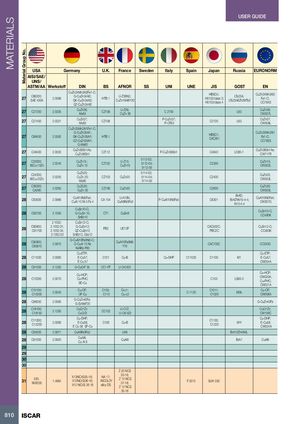 MATERIALS Material Group No. USER GUIDE USA Germany U.K. France Sweden Italy Spain Japan Russia EURONORM AISI/SAE/ UNS/ ASTM/AA Werkstoff DIN BS AFNOR SS UNI UNE JIS GOST EN CuZn34Mn3Al2Fe1-C;27C86200;SAE 430A2.0596G-CuZn34Al2;GK-CuZn34Al2;HTB 1U-Z36N3;CuZn19Al6Y20GZ-CuZn34Al2HBSC4;H5102/class 3;H5102/class 4LTs23A;LTs23A6Zh3MTs2CuZn34Mn3Al2Fe1-C;CC764S 27 C27200 2.0335 CuZn36;Ms64 CZ108 U-Z36;CuZn 36 C 2700 L63 CuZn36;CW507L 27 C27400 2.0321 CuZn37;Ms63 CZ108 P-CuZn37;P-OT63 C2720 L63 CuZn37;CW508L CuZn35Mn2Al1Fe1-C; G-CuZn35Al1;27C864002.0592GK-CuZn35Al1;HTB 1GZ-CuZn35Al1; HBSC1;CAC301 CuZn35Mn2Al1Fe1-C;CC765S G-Ms60 27 C46400 2.0530 CuZn38Sn1As;CuZn38Sn1CZ112 P-CuZn39Sn1 C4640 LO60-1 CuZn38Sn1As;CW717R 27 C23000;85Cu-15Zn2.0240 CuZn15 ;CuZn 15 CZ102 U-Z15;CuZn15 5112-02;5112-04;5112-05 C2300 CuZn15;CW502L 27 C24000;80Cu-20Zn2.0250 CuZn20; 5114-02;CuZn 20;CZ103CuZn205114-04;Ms805114-05C2400 CuZn20;CW503L 27 C26000;CA260 2.0265 CuZn30;CuZn 30 CZ106 CuZn30 C2600 CuZn30;CW505L 28 C63000 2.0966 CuAl10Ni5Fe4;CuAI 10 Ni 5 Fe 4CA 104U-A10N;CuAl9Ni5Fe3 P-CuAl10Ni5Fe5 C6301 BrAD;BrAZhN10-4-4;N10-4-4CuAl10Ni5Fe4;CW307G CuSn10-C;28C907002.1050G-CuSn 10;CT1CuSn8SnBz10 CuSn10-C;CC480K 2.1052; CuSn12-C; 28 C90800;C917002.1052.01;2.1052.04;G-CuSn12;GZ-CuSn12;PB2 UE12P CAC502C; CuSn12-C;PBC2CCC483K 2.1052.03 SnBz12, Gbz12 28 C95800;C95810 G-CuAl10Fe5Ni5-C;2.0975G-CuAI 10 Ni;NiAlBz-F60CuAl10Fe5Ni5Y70 CAC703C CC333G Cu-ETP; Cu-ETP; 28 C11000 2.0060 E-Cu57; C101 Cu-B Cu-DHP C11020 C1100 M1 E-Cu57; E Cu 57 CW004A 28 C81500 2.1292 G-CuCrF 35 CC1-FF U-Cr0.8Zr Cu-HCP;28C103002.0070Cu-PHC;SE-Cu Cu-HCP;C103LS60-2CW020A;Cu-PHC;CW021A 28 C10100;C102002.0040 Cu-OF; C103; Ci-c1;OF-CuC110Cu-c2 C-1120 C1011;C1020 M0b Cu-OF;CW008A 28 C86550 2.0590 G-CuZn40Fe;G-SoMsF30 G-CuZn40Fe 28 C18100;C181502.1293 CuCr1Zr;CuCrZr CC102 U-C1Z;U-Cr0.8Zr CuCr1Zr;CW106C 28 C11000;C122002.0090 Cu-DHP;E-Cu58; C106E Cu 58SF-CuCu-B C1100;C1220 M1f Cu-DHP;E-Cu58;CW024A 28 C95500 2.0971 CuAl9Ni3Fe2 UA9 BrA10Zh4N4L 28 C61000 2.0920 CuAl8;Cu Al 8 CuAl8 BrA7 CuAl8 29 29 30 30 Z 20 NCS 31 330;N08330 1.4864 X12NiCrSi35-16;X12NiCrSi36-16;X12 NiCrSi 36 16NA 17;INCOLOYalloy DS33-16;Z 12 NCS37-18;Z 12 NCSF.3313SUH 330 35-16 810 ISCAR