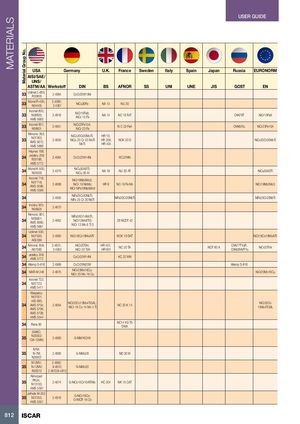 MATERIALS Material Group No. USER GUIDE USA Germany U.K. France Sweden Italy Spain Japan Russia EURONORM AISI/SAE/ UNS/ ASTM/AA Werkstoff DIN BS AFNOR SS UNI UNE JIS GOST EN 33 Udimet L-605;R306052.4964 CoCr20W15Ni 33 Monel R-405;N044052.4360;2.4361 NiCu30Fe NA 13 NU 30 Inconel 600;33N06600;2.4816AMS 5665NiCr15Fe8;NiCr 15 FeNA 14 NC 16 FeT ChN78T NiCr15Fe8 33 Inconel 601;N066012.4851 NiCr23Fe15A;NiCr 23 Fe N C 23 FeA ChN60Yu NiCr23Fe15A Nimonic 263;33N07263;AMS 5872;2.4650AMS 5886NiCo20Cr20MoTi;HR 10;NiCo 20 Cr 20 MoTiHR 206;NCK 20 DMoTiHR 404 NiCo20Cr20MoTi Haynes 188; 34 Jetalloy 209;R30188;2.4964 CoCr22W14Ni KC22WN AMS 5772 34 Monel K-500;N055002.4375 NiCu30Al3Ti;NiCu 30 AlNA 18 NU 30 AT NiCu30Al3Ti Inconel 718;34N07718;AMS 5596;AMS 55892.4668NiCr19Nb5Mo3;NiCr 19 NbMo;HR 8NC 19 Fe NbNiCr19Fe19Nb5Mo3 NiCr19Nb5Mo3 34 2.4955 NiFe25Cr20NbTi;NiFe 25 Cr 20 NbTiNiFe25Cr20NbTi NiFe25Cr20NbTi 34 Incoloy 925;N099252.4670 Nimonic 901;34N09901;AMS 5660;2.4662AMS 5661NiFe35Cr14MoTi;NiCr13Mo6Ti3;NiCr 13 Mo 6 Ti 3Z8 NCDT 42 Udimet 500; 34 N07500; 2.4983 NiCr18Co18MoAlTi NCK 19 DAT NiCr18Co18MoAlTi AISI 684 34 Nimonic 80A;N070802.4631;2.4952 NiCr20TiAl;NiCr 20 TiAlHR 401;HR 601NC 20 TA NCF 80 A ChN77TYuR;ChN56VMTYuNiCr20TiAl 34 Jetalloy 209;AMS 5772 CoCr22W14Ni KC 22 WN 34 Altemp S-816 2.4989 CoCr20Ni20W Altemp S-816 34 MAR-M 246 2.4675 NiCr23Mo16Cu;NiCr 23 Mo 16 Cu NiCr23Mo16Cu Inconel 722; 34 N07722; AMS 5411 Waspaloy; N07001; AISI 685;34AMS 5704;AMS 5706;2.4654NiCr20Co13Mo4Ti3AL;NiCr 19 Co 14 Mo 4 TiNC 20 K 14 NiCr20Co13Mo4Ti3AL AMS 5708; AMS 5544 34 Rene 80 NC14 K9 T5DWA 5388C; 35 N30002;CW-12MW; 2.4883 G-NiM16CrW N7M; 35 N-7M; 2.4685 G-NiMo28 ND 30 M N30007 N12MV; 2.4882; 35 N-12MV; 9.4810; G-NiMo30 N30012 2.4810/9.4810 Nimocast 35 PK24;N13100; 2.4674 G-NiCo15Cr10AlTiMo HC 204 NK 15 CAT AMS 5397 Jethete M-252;35N07252;2.4916AMS 5551G-NiCr19Co;G-NICR 19 Co 812 ISCAR