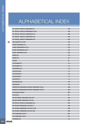 ALPHABETICAL INDEX ALPHABETICAL INDEX 60° PARTIAL PROFILE THREADING FLT 649 60° PARTIAL PROFILE THREADING FLT-CB 649 60° PARTIAL PROFILE THREADING FLTF 648 60° PARTIAL PROFILE THREADING FLTK 649 60° PARTIAL PROFILE THREADING FLTP 650 A ABC MAHDR-#-XL-JHP 782 ACME THREADING FLA 678 ACME THREADINGFLA-PT-E 679 ACME THREADINGFLA-PT-I 679 ACME THREADING FLAS 678 ADMP D22 519 ADMP D45 521 AD-SET 87 A/E-SDXNR/L-07 107 A/E-SDZNR/L-07 107 A/E-SEXPR/L-03 112 A/E/S-SCLCR/L 111 A/E/S-SDUCR/L 112 A/E/S-STFPR/L 117 A/E-STFPR-X 117 A/E-SWLNR/L-04 103 A/E-SWUCR 119 AMERICAN STANDARD BUTTRESS THREADING FLTB-A 688 AMERICAN STANDARD BUTTRESS THREADING FLTB-B 688 Anti-Vibration Blades 284 A-PCLXR/L 99 API BUTTRESS THREADING FLDC-B-E 692 API BUTTRESS THREADING FLDC-B-I 693 API PARTIAL PROFILE THREADING FLD 691 API ROUND THREADING FLDC-RD-75 689 API ROUND THREADING FLDC-RD-75-CB 689 API ROUND THREADING FLDC-RD-75M 690 API THREADING FLDC-E 691 API THREADING FLDC-I 691 A-PSKNR/L-09 115 816 ISCAR