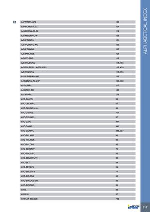 ALPHABETICAL INDEX A A-PTFNR/L-X/G 108 A-PWLNR/L-X/G 104 A-SDUCR/L-13-SL 112 A/S-MWLNR/L-W 103 A/S-PCLNR/L 101 A/S-PCLNR/L-X/G 102 A/S-PDUNR/L 106 A/S-PWLNR/L 104 A/S-STLPR/L 118 A/S-SVLBCR/L 114, 455 A/S-SVLFCR/L; A-SVUCR/L 113, 455 A/S-SVQCR/L 113, 455 A-SVLFNR-AL-JHP 108 A-SVQNR/L-AL-JHP 108, 458 A-SVUNR/L 107 A-SXFOR-DR 120 A-SXFOR/L 119 AVC-D80-VH 98 AVC-DDUNR/L 97 AVC-DDUNR/L-VH 98 AVC-D-SIR/L 707 AVC-DVUNR/L 97 AVC-GAIC 347 AVC-GAIR/L 347 AVC-GEAIR/L 346, 707 AVC-PCLNR/L 96 AVC-PCLXR/L 96 AVC-SCLCR/L 95 AVC-SDJCN-Y 76 AVC-SDUCR/L 95 AVC-SDUCR/L-VH 98 AVC-SET 94 AVC-SET-LEV 94 AVC-SRDCN-Y 77 AVC-SVLCR/L 96 AVC-SVLCR/L-VH 98 AVC-SVUCR/L 95 AV-D 93 AV-D-VH 97 AV FLEX-SLEEVE 742 817