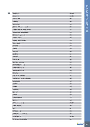 ALPHABETICAL INDEX G GHAPR/L-8 286, 580 GHAR/L-8 285, 580 GHAR/L-JHP 286 GHDKR/L 446 GHDR/L-8A 445 GHDR/L-JHP (long pocket) 285 GHDR/L-JHP-MC (short pocket) 277 GHDR/L-JHP (short pocket) 276 GHDR/L (long pocket) 285 GHDR/L/N 12/14 333 GHDR/L (short pocket) 275 GHFG-R/L-8 579 GHFGR/L-8 579 GHGR/L 278 GHIC-50 346 GHIC-70 355 GHIC-85 356 GHIFR/L-A 445 GHIR/L-C (W=4-6.4) 344 GHIR/L-SC (W=2-4.8) 345 GHIR/L (W=1.9-6.4) 344 GHIR/L (W=7.0-8.3) 355 GHIUR/L 345 GHIUR/L-C-22.5A-8V 444 GHIUR/L-C-A (15° & 27.5°) Bars 444 GHIUR/L-UC 444 GHMPR/L 273 GHMR/L 273 GHMUR/L 303 GHPCOR 409 GHSR/L 373 GHSR/L-JHP-SL 374 GHVR/L 445 GIA-K (long pocket) 299, 581 GIA-K (W=3-6) 298 GIF 297 GIF-E (W=4-6) 292 GIF-E (W=4-6 full radius) 294 GIF-E (W=8,10) 292, 581 GIF-E (W=8,10 full radius) 294 827