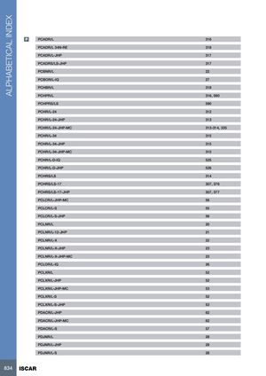 ALPHABETICAL INDEX P PCADR/L 316 PCADR/L 34N-RE 318 PCADR/L-JHP 317 PCADRS/LS-JHP 317 PCBNR/L 22 PCBOR/L-IQ 27 PCHBR/L 318 PCHPR/L 316, 590 PCHPRS/LS 590 PCHR/L-24 312 PCHR/L-24-JHP 313 PCHR/L-24-JHP-MC 313-314, 335 PCHR/L-34 315 PCHR/L-34-JHP 315 PCHR/L-34-JHP-MC 315 PCHR/L-D-IQ 525 PCHR/L-D-JHP 526 PCHRS/LS 314 PCHRS/LS-17 307, 376 PCHRS/LS-17-JHP 307, 377 PCLCR/L-JHP-MC 56 PCLCR/L-S 55 PCLCR/L-S-JHP 56 PCLNR/L 20 PCLNR/L-12-JHP 21 PCLNR/L-X 22 PCLNR/L-X-JHP 23 PCLNR/L-X-JHP-MC 23 PCLOR/L-IQ 26 PCLXR/L 52 PCLXR/L-JHP 52 PCLXR/L-JHP-MC 53 PCLXR/L-S 52 PCLXR/L-S-JHP 53 PDACR/L-JHP 62 PDACR/L-JHP-MC 62 PDACR/L-S 57 PDJNR/L 28 PDJNR/L-JHP 29 PDJNR/L-S 28 834 ISCAR