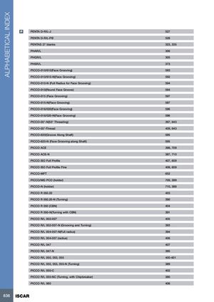 ALPHABETICAL INDEX P PENTA D-R/L-J 527 PENTA D-R/L-PB 528 PENTAS 27 blanks 323, 335 PHAR/L 306 PHGR/L 305 PHSR/L 373 PICCO-010/610(Face Grooving) 593 PICCO-010/610-N(Face Grooving) 592 PICCO-010-N (Full Radius for Face Grooving) 594 PICCO-010(Round Face Groove) 594 PICCO-015 (Face Grooving) 597 PICCO-015-N(Face Grooving) 597 PICCO-016/020(Face Grooving) 596 PICCO-016/020-N(Face Grooving) 596 PICCO-55°-N(55° Threading) 397, 643 PICCO-55°-Thread 409, 643 PICCO-620(Groove Along Shaft) 595 PICCO-620-N (Face Grooving along Shaft) 595 PICCO ACE 398, 709 PICCO ACE-N 387, 710 PICCO ISO Full Profile 407, 659 PICCO ISO Full Profile Fine 408, 659 PICCO-MFT 652 PICCO/MG PCO (holder) 709, 399 PICCO-N (holder) 710, 388 PICCO R 050.20 403 PICCO R 050.20-N (Turning) 390 PICCO R 050 (CBN) 404 PICCO R 050-N(Turning with CBN) 391 PICCO R/L 002-007 405 PICCO R/L 002-007-N (Grooving and Turning) 393 PICCO R/L 004-007-N(Full radius) 394 PICCO R/L 004-007 (radius) 406 PICCO R/L 047 407 PICCO R/L 047-N 395 PICCO R/L 050, 053, 055 400-401 PICCO R/L 050, 053, 055-N (Turning) 389 PICCO R/L 050-C 402 PICCO R/L 050-NC (Turning, with Chipbreaker) 390 PICCO R/L 060 406 836 ISCAR
