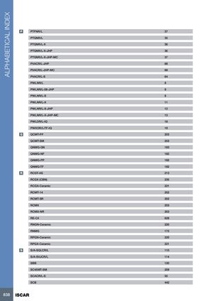 ALPHABETICAL INDEX P PTFNR/L 37 PTGNR/L 35 PTGNR/L-X 36 PTGNR/L-X-JHP 36 PTGNR/L-X-JHP-MC 37 PVACR/L-JHP 68 PVACR/L-JHP-MC 68 PVACR/L-S 64 PWLNR/L 8 PWLNR/L-08-JHP 9 PWLNR/L-S 8 PWLNR/L-X 11 PWLNR/L-X-JHP 12 PWLNR/L-X-JHP-MC 13 PWLOR/L-IQ 18 PWXOR/L-TF-IQ 19 Q QCMT-PF 203 QCMT-SM 203 QNMG-GN 183 QNMG-NF 182 QNMG-PP 182 QNMG-TF 182 R RCGT-AS 213 RCGX (CBN) 235 RCGX-Ceramic 221 RCMT-14 202 RCMT-SR 202 RCMX 203 RCMX-NR 203 RE-C# 628 RNGN-Ceramic 220 RNMG 172 RPGN-Ceramic 220 RPGX-Ceramic 221 S S/A-SQLCR/L 110 S/A-SVJCR/L 114 SBB 120 SC45MT-SM 209 SCACR/L-S 55 SCB 442 838 ISCAR
