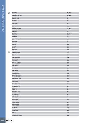 ALPHABETICAL INDEX S SVJCR/L 65, 453 SVJCR/L-16-JHP 66, 454 SVJCR-PAD 67 SVJNR/L-F 33 SVPCR/L 69 SVVCN 69, 454 SVVNN-AL-JHP 34, 457 SVVNN-F 34 SVXCR/L 69, 454 SWAPR/L 73 SWAPR-PAD 73 SWDPR/L 74 SXCIB 440 SXCIR 359 SXCNN 359 T TAGB/TAGBA 333 TAG N-A 510 TAG N-C/W/M 506 TAG N-HF 506 TAG N-J/JS/JT 508 TAG N-LF 509 TAG N-MF 507 TAG N-UT 510 TAGPAD-JHP 500 TAGPAD-XL-JHP 500 TAGPAD-Y-JHP 519 TAG R/L-C 507 TAG R/L-J/JS 509 TCBNR/L-CH 88 TCGT-AS 211 TCKNR/L-CH 88 TCLNR/L-CH 88 TCMT (CBN) 234 TCMT-F3P 201 TCMT-M3M 201 TCMT (PCD) 223 TCMT-PF 201 TCMT-SM 202 TGAD 498 TGAD RE/LE-JHP 498 842 ISCAR