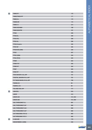 ALPHABETICAL INDEX T TNMG-TF 170 TNMG/TNGG-PP 171 TNMG-VL 170 TNMM-NR 172 TNMS-12 214 TNMX-M3/4MW 168 TNMX-M3/4PW 167 TPGB 206 TPGB-XL 206 TPGH-R/L 206 TPGH-XL 206 TPGN-Ceramic 220 TPGT-SP 205 TPGW-M3 (CBN) 235 TPGX 207 TPGX (CBN) 234 TPGX (PCD) 224 TPMR 204 TPMR-FTF 205 TPMR-PF 204 TPMT 205 TPMT-PF 205 TR45 MAHDR-#-XL-JHP 781 TR45TNL MAHDN-R-XL-JHP 781 TR TNK36 MAHDL-R-XL-JHP 782 TSDNN-CH 89 TSSNR/L-CH 89 TSU-M08 V60-JHP 777 U UBHCR/L 618 UMGR 412 UMGR-A55 412, 642 UMGR-A60 412, 650 UNJ THREADING FLJ 681 UNJ THREADING FLJF 682 UNJ THREADING FLJK 682 UNJ THREADING FLJP 682 UN THREADING FLTC-E 665 UN THREADING FLTC-I 665 V V-ASH-MC 779 VBGW/VBMW-2 (CBN) 232 845