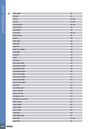 ALPHABETICAL INDEX V VBMT (CBN) 232 VCET-WF 197 VCGT-AF 212, 456 VCGT-AS 211, 456 VCGT-DW (PCD) 223, 456 VCGT-F1M-20P 196 VCGT-MD/PF 197 VCGT (PCD) 223, 457 VCGW-2 (CBN) 232 VCMT-14 198 VCMT (CBN) 222 VCMT-F3M 195 VCMT-F3P 195 VCMT-FPC-CERMET 196 VCMT-M3M 196 VCMT-SM 197 VCMW 198 VDI AV-JHP 742 VDI-B1/B4A-JHPMC 740 VDI-B1/B4AK-JHPMC 740 VDI-B2/B3A-JHPMC 740 VDI-B2/B3AK-JHPMC 740 VDI-C1/C4A-JHPMC 741 VDI-C1/C4AK-JHPMC 741 VDI-C2/C3A-JHPMC 741 VDI-C2/C3AK-JHPMC 741 VDI-DTF50 453 VDI-DTF50E-L60R 453 VDI##-P V60-JHP 775 VDI#### V##-JHP 775 V## MAHD-XL-JHP 779 V## MAHD#-#-XL-##-JHP 778 VNGA-2 (CBN) 231 VNGA-4 (CBN) 231 VNGA-Ceramic 219 VNGA-J(CBN) 231 VNGG-M3N 210 VNGG-M4HM (CBN) 231 VNGU-R3N 210, 458 VNMG-F3M 164 846 ISCAR