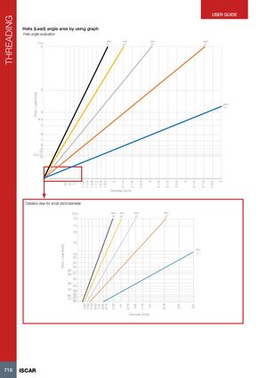THREADING Pitch / Lead [inch] Pitch / Lead [inch] 5/8 3/4 1/8 1 1 1/81/64 1 1/41/32 1 3/81/16 1 1/23/32 1 5/81/85/32 1 3/43/16 27/32 2 1/41/4 5/16 2 1/2 3/8 2 3/47/16 31/2 3 1/4 9/16 3 1/2 3 3/4 5/8 4 4 1/43/4 4 1/2 4 3/4 5 USER GUIDE Helix (Lead) angle area by using graph Helix angle evaluation φ(φL) φ(φL) φ(φL) φ(φL) T.P.I2 5° 4° 3° 2° 3 φ(φL) 1° 4 4.5 5 6 7 8 9 10 11.5 11 12 Diameter [inch] Detailed view for small pitch/diameter T.P.I φ(φL) φ(φL) φ(φL) φ(φL) 13 5° 4° 3° 2° 14 16 18 φ(φL) 19 1° 20 22 24 26 28 27 32 36 40 44 48 6072 5664 80 Diameter [inch] 718 ISCAR