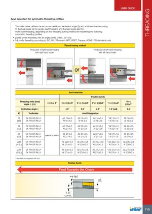THREADING USER GUIDE Anvil selection for symmetric threading profiles The table below defines the recommended insert inclination angle (β) and anvil selection according to the helix angle (φ) for single-start threading and the lead angle (φL) for multi-start threading, depending on the threading turning method for machining the following symmetric threading profiles: • partial profile threading with an angle profile of 60°, 55° only • full profile threading according to ISO, UN, Whitworth, NPT, BSPT, Trapeze, ACME, RD standards only Thread turning method Production of right-hand threading Production of left-hand threading with right-hand holder with left-hand holder LH or LH RH RH Anvil selection Positive Anvils Threading helix (lead)angle φ (φL) φ (φL)≥ 5º 4º≤φ (φL)<5º 3º<φ (φL)≤4º 2º<φ (φL)≤3º 1º<φ (φL)≤2º 0º<φ(φL)≤1º Inclination Angle β 4.5º 3.5º 2.5º 1.5º (std) 0.5º IC Toolholder Anvil Designation 16 EX RH OR IN LH AE 16+4.5 AE 16+3.5 AE 16+2.5 * AE 16+1.5 AE 16+0.5 (3/8) EX RH OR IN LH AI 16+4.5 AI 16-3.5 AI 16+2.5 * AI 16+1.5 AI 16+0.5 22 EX RH OR IN LH AE 22+4.5 AE 22+3.5 AE 22+2.5 * AE 22+1.5 AE 22+0.5 (1/2) EX RH OR IN LH AI 22+4.5 AI 22+3.5 AI 22+2.5 * AI 22+1.5 AI 22+0.5 27(5/8) EX RH OR IN LHEX RH OR IN LH special solution AE 27-4.5AI 27+4.5 AE 27+3.5AI 27+3.5 AE 27+2.5 * AE 27+1.5 AE 27+0.5AI 27+2.5* AI 27+1.5AI 27+0.5 22U EX RH OR IN LH AE 22U+4.5 AE 22U+3.5 AE 22U+2.5 * AE 22U+1.5 AE 22U+0.5 (1/2U) EX RH OR IN LH AI 22U+4.5 AI 22U+3.5 AI 22U+2.5 * AI 22U+1.5 AI 22U+0.5 27U EX RH OR IN LH AE 27U+4.5 AE 27U+3.5 AE 27U+2.5 * AE 27U+1.5 AE 27U+0.5 (5/8U) EX RH OR IN LH AI 27U+4.5 AI 27U+3.5 AI 27U+2.5 * AI 27U+1.5 AI 27U+0.5 * Standard anvil supplied with tool Positive Anvils Feed Towards the Chuck +φ (φL) +β 1.5° const. 719