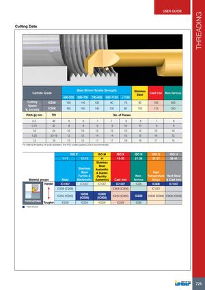 THREADING USER GUIDE Cutting Data Carbide Grade Steel (N/mm Tensile Strength) StainlessSteelCast Iron Non-ferrous 400-500 500-700 700-850 850-1150 >1150 Cutting IC228 160 140 120 90 70 90 100 300 Speed Vc (m/min) IC908 185 160 140 105 80 105 115 350 Pitch (p) mm TPI No. of Passes 0.5 48 6 6 7 7 8 8 7 6 0.75 32 8 8 9 9 10 10 9 8 1.0 24 10 10 12 12 12 12 12 10 1.25 20-19 12 12 14 14 15 15 14 12 1.5 16 15 15 17 17 18 18 17 15 For internal threading of small diameters, the PVD coated grade IC228 is recommended. ISO P ISO M ISO K ISO N ISO S ISO H 1-11 12-13 14 15-20 21-28 31-37 38-41 Stainless Steel Stainless Austenitic Steel & Duplex High Ferritic & (Ferritic- Non- Temperature Hard Steel Material groups Steel Martensitic Austenitic) Cast Iron ferrous Alloys & Cast Iron Harder IC1007 IC1007 IC1007 IC1007 IC08 IC806 IC1007 IC808 (IC908) IC808 (IC908) IC1007 IC250 (IC950) IC808(IC908) IC808(IC908) IC250 (IC950) IC228 IC808 (IC908) IC808 (IC908) THREADING Tougher IC228 IC228 IC228 IC228 IC28 First choice 725