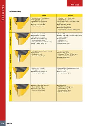 THREADING Plastic DeformationPremature WearInsert BreakageBuild Up EdgeVibration USER GUIDE Troubleshooting Cause Solution • Excessive heat in cutting zone • Reduce RPM / Reduce depth • Wrong carbide grade of cut / Check turned dia. • Inadequate coolant supply • Use coated grade / Use harder grade • Depth of cut too large • Apply coolant • Cutting speed too high • Reduce depth of cut / • Nose radius too small Increase no. of passes • Reduce cutting speed • If possible use insert with larger radius • Cutting speed too high • Reduce RPM • Infeed depth too small • Modify flank infeed / Increase depth of cut • Highly abrasive material • Use coated grade • Inadequate coolant supply • Apply coolant • Wrong inclination anvil • Reselect anvil • Wrong turned dia. prior to threading • Check turned dia. • Insert is above center line • Check center height • Wrong turned dia. prior to threading • Check turned dia. • Wrong grade • Use tougher grade • Poor chip control • Change to M-Type / B-Type inserts • Incorrect center height and use modified flank infeed • Check center height • Cutting edge too cold • Increase RPM / Increase depth of cut • Wrong grade • Use coated grade • Inadequate coolant supply • Apply coolant • Incorrect cutting speed • Increase cutting speed • Incorrect workpiece clamping • Use soft jaws • Incorrect tool setup • Check tool overhang / Use • Incorrect cutting speed anti-vibration bars • Incorrect center height • Increase cutting speed • Check center height 726 ISCAR