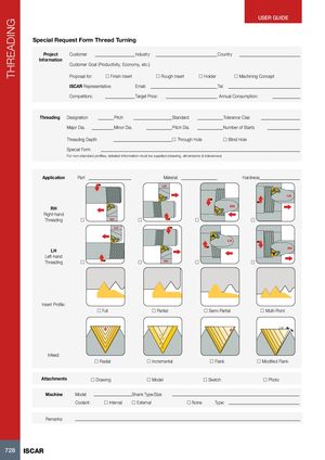 THREADING USER GUIDE Special Request Form Thread Turning Project Customer Industry Country Information Customer Goal (Productivity, Economy, etc.): Proposal for: o Finish Insert o Rough Insert o Holder o Machining Concept ISCAR Representative: Email: Tel: Competitors: Target Price: Annual Consumption: Threading Designation Pitch Standard Tolerance Clas Major Dia. Minor Dia. Pitch Dia. Number of Starts Threading Depth o Through Hole o Blind Hole Special Form For non-standard profiles, detailed information must be supplied (drawing, dimensions & tolerances) Application Part Material Hardness LH LH RH RH Right-hand Threading o RH o o o LH LH LH RH Left-hand Threading o o RH o o Insert Profile: o Full o Partial o Semi-Partial o Multi-Point 1-3° 1 2 3 4 5 Infeed: o Radial o Incremental o Flank o Modified Flank Attachments o Drawing o Model o Sketch o Photo Machine Model Shank Type/Size Coolant: o Internal o External o None Type: Remarks: 728 ISCAR