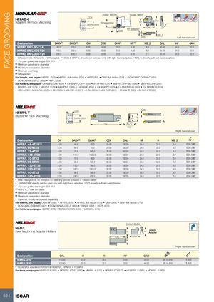 FACE GROOVING Holder: MAHPL Holder: MAHR HFPAD-6 CDX Adapters for Face Machining WF(assembly) HF OAH DAXN-DAXX WF (adapter) OAL D OHN CW WB_2 Left-hand shown Designation DAXN(1) DAXX(2) CW CDX OHN(3) WF(4) WB_2 OAL HF OAH HFPAD 6R/L-60-T14 60.0 100.0 6.00 14.00 16.0 4.50 6.8 40.50 24.0 32.0 HFPAD 6R/L-100-T20 100.0 200.0 6.00 20.00 21.0 4.50 6.8 45.50 24.0 32.0 HFPAD 6R/L-200-T20 200.0 3000.0 6.00 20.00 21.0 4.50 7.1 45.50 24.0 32.0 • WF(assembly)=WF(shank) + WF(adapter) • DGN & GRIP 6.. inserts can be used only with right-hand adapters, HGPL 6.. inserts with left-hand adapters • For user guide, see pages 604-613 (1) Minimum penetration diameter (2) Maximum penetration diameter (3) Minimum overhang (4) WF(adapter) For inserts, see pages: HFPR/L (576) • HFPR/L (full radius) (576) • GRIP (269) • GRIP (full radius) (270) • DGN/DGNC/DGNM-C (481) • DGN/DGNM-J/JS/JT (483) • HGPL (578) For holders, see pages: C#-MAHD-JHP (624) • C#-MAHPD-JHP (625) • IH-HFPAD (571) • MAHR/L-JHP-MC (280) • MAHPR/L-JHP (281) • MAHR/L-JHP (279) • MAHR/L (279) • MAHPR/L (280) • C#-MAHD (624) • C#-MAHPD (625) • C#-MAHDR-45 (623) • C#-MAHDOR (624) • HSK A63WH-MAHUR/L (632) • HSK A63WH-MAHDR-45 (631) • HSK A63WH-MAHDOR (631) • IM-MAHD (633) • IM-MAHPD (633) HFFR/L-T CDXBlades for Face MachiningDAXN-DAXX CW LHFH R OAL WB_2 150° Right-hand shown Designation CW DAXN(2) DAXX(3) CDX OAL HF H WB_2 HFFR/L 48-4T25 (1) 4.00 48.0 60.0 25.00 150.00 24.8 32.0 5.2 EDG 33B* HFFR/L 60-4T25 4.00 60.0 75.0 25.00 150.00 24.8 32.0 5.2 EDG 33B* HFFR/L 75-4T30 4.00 75.0 140.0 30.00 150.00 24.8 32.0 5.2 EDG 33B* HFFR/L 140-4T30 4.00 140.0 1500.0 30.00 150.00 24.8 32.0 3.2 EDG 33B* HFFR/L 70-5T32 5.00 70.0 95.0 32.00 150.00 24.8 32.0 5.2 EDG 33B* HFFR/L 95-5T35 5.00 95.0 130.0 35.00 150.00 24.8 32.0 5.2 EDG 33B* HFFR/L 130-5T38 5.00 130.0 180.0 38.00 150.00 24.8 32.0 5.2 EDG 33B* HFFR/L 180-5T38 5.00 180.0 1500.0 38.00 150.00 24.8 32.0 4.0 EDG 33B* HFFR/L 90-6T32 6.00 90.0 180.0 32.00 150.00 24.8 32.0 5.2 EDG 33B* HFFR/L 180-6T38 6.00 180.0 400.0 38.00 150.00 24.8 32.0 5.2 EDG 33B* • After initial groove, no limitation to widening groove outward or toward center. • DGN & GRIP inserts can be used only with right-hand adapters, HGPL inserts with left-hand blades • For user guide, see pages 604-613 (1) HGPL 4...Y with LH blade (2) Minimum penetration diameter (3) Maximum penetration diameter * Optional, should be ordered separately For inserts, see pages: DGN-MF (485) • HFPR/L (576) • HFPR/L (full radius) (576) • GRIP (269) • GRIP (full radius) (270) • DGN/DGNC/DGNM-C (481) • DGN/DGNM-J/JS/JT (483) • DGN-W (482) • HGPL (578) For holders, see pages: SGTBF (618) • SGTBU/SGTBN (616) • UBHCR/L (618) Coolant Outlet HAR/L Face Machining Adapter Holders H HF HFAELAdapter OAL OAW B Right-hand shown Designation OAL B H HF OAW HAR/L 25C 110.00 25.0 25.0 25.0 39.00 SR 14-519 T-20/3 HAR/L 32C 130.00 32.0 32.0 32.0 46.00 SR 14-519 T-20/3 • Holders for adapters HFAER/L & HGAER/L, HFAIR/L & HGAIR/L For tools, see pages: HFAER/L-4 (565) • HFAER/L-5T, 6T (566) • HFAIR/L-4 (572) • HFAIR/L-DG (573) • HGAER/L-3 (565) • HGAIR/L-3 (568) 564 ISCAR