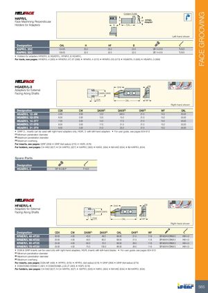 FACE GROOVING Coolant Outlet HAPR/LFace Machining Perpendicular H HF HFAELAdapter Holders for Adapters B OAL Left-hand shown Designation OAL H HF B HAPR/L 25C 124.00 25.0 25.0 25.0 SR 14-519 T-20/3 HAPR/L 32C 139.00 32.0 32.0 32.0 SR 14-519 T-20/3 • Holders for adapters HFAER/L & HGAER/L, HFAIR/L & HGAIR/L. For tools, see pages: HFAER/L-4 (565) • HFAER/L-5T, 6T (566) • HFAIR/L-4 (572) • HFAIR/L-DG (573) • HGAER/L-3 (565) • HGAIR/L-3 (568) HGAER/L-3 OHX CW Adapters for External Facing Along Shafts DAXN-DAXX CDX OAL WF Right-hand shown Designation CDX CW DAXN(1) DAXX(2) OHX(3) WF OAL HGAER/L 12-3M 2.00 3.00 12.0 500.0 21.0 10.2 55.00 HGAER/L 12-3T6 6.00 3.00 12.0 15.0 21.0 10.2 55.00 HGAER/L 14-3T7 7.00 3.00 14.0 17.0 21.0 10.2 55.00 HGAER/L 17-3T8 8.00 3.00 17.0 21.0 21.0 10.2 55.00 HGAER/L 21-3T9 9.00 3.00 21.0 25.0 21.0 10.2 55.00 • GRIP 3... inserts can be used with right-hand adapters only, HGPL 3 with left-hand adapters • For user guide, see pages 604-613 (1) Minimum penetration diameter (2) Maximum penetration diameter (3) Maximum overhang For inserts, see pages: GRIP (269) • GRIP (full radius) (270) • HGPL (578) For holders, see pages: C#-HAD (627) • C#-HAPR/L (627) • HAPR/L (565) • HAR/L (564) • IM-HAD (634) • IM-HAPR/L (634) Spare Parts Designation HGAER/L-3 SR 16-236 P T-15/3 HFAER/L-4 OHX CW Adapters for External Facing Along Shafts DAXN-DAXX CDX OAL WF Right-hand shown Designation CDX CW DAXN(1) DAXX(2) OAL OHX(3) WF HFAER/L 40-4T20 20.00 4.00 40.0 48.0 68.50 21.0 11.6 SR M5X16 DIN912 HW 4.0 HFAER/L 48-4T20 20.00 4.00 48.0 60.0 68.50 21.0 11.6 SR M5X16 DIN912 HW 4.0 HFAER/L 60-4T25 25.00 4.00 60.0 75.0 68.50 26.0 11.6 SR M5X16 DIN912 HW 4.0 HFAER/L 75-4T25 25.00 4.00 75.0 100.0 68.50 26.0 11.6 SR M5X16 DIN912 HW 4.0 • DGN & GRIP inserts can be used only with right-hand adapters, HGPL inserts with left-hand blades • For user guide, see pages 604-613 (1) Minimum penetration diameter (2) Maximum penetration diameter (3) Maximum overhang For inserts, see pages: DGN-MF (485) • HFPR/L (576) • HFPR/L (full radius) (576) • GRIP (269) • GRIP (full radius) (270) • DGN/DGNC/DGNM-C (481) • DGN/DGNM-J/JS/JT (483) • HGPL (578) For holders, see pages: C#-HAD (627) • C#-HAPR/L (627) • HAPR/L (565) • HAR/L (564) • IM-HAD (634) • IM-HAPR/L (634) 565