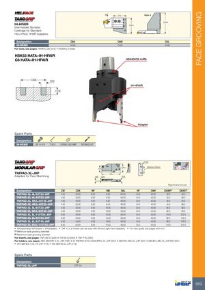 FACE GROOVING A OAL View A IH-HFAIR OAWOAH Intermediate Serrated Cartridge for Standard HELI-FACE HFAIR Adapters. Designation OAH OAW OAL IH-HFAIR 55.40 72.50 44.90 For tools, see pages: HFAIR/L-DG (573) • HGAIR/L-3 (568) HSK63 HATA+IH-HFAIR C6 HATA+IH-HFAIR HSK63/C6 HATA DAX CW IH-HFAIR CDX Adapter Spare Parts Designation IH-HFAIR SR 14-519 T-20/3 O-RING 19X2 NBR SR M6X20-XT CDX HF OAH ØDAXN-DAXX TNFPAD-XL-JHP OAL Adapters for Face Machining WF CW WB Right-hand shown Designation CW CDX WF WB OAL HF OAH DAXN(1) DAXX(2) TNFPAD-XL 4L-35T20-JHP 4.00 20.00 8.00 9.50 65.00 34.0 43.00 35.0 53.0 TNFPAD-XL 4L-45T20-JHP 4.00 20.00 8.00 9.50 65.00 34.0 43.00 45.0 68.0 TNFPAD-XL 4R/L-35T35-JHP 4.00 35.00 8.00 9.50 80.00 34.0 43.00 35.0 53.0 TNFPAD-XL 4R/L-45T35-JHP 4.00 35.00 8.00 9.50 80.00 34.0 43.00 45.0 68.0 TNFPAD-XL 5L-60T20-JHP 5.00 20.00 8.00 10.00 65.00 34.0 43.00 60.0 90.0 TNFPAD-XL 5R/L-60T40-JHP 5.00 40.00 8.00 10.00 85.00 34.0 43.00 60.0 90.0 TNFPAD-XL 6L-110T20-JHP 6.00 20.00 8.00 10.50 65.00 34.0 43.00 110.0 312.0 TNFPAD-XL 6L-80T20-JHP 6.00 20.00 8.00 10.50 65.00 34.0 43.00 80.0 122.0 TNFPAD-XL 6L-80T45-JHP 6.00 45.00 8.00 10.50 90.00 34.0 43.00 80.0 122.0 TNFPAD-XL 6R/L-110T50-JHP 6.00 50.00 8.00 10.50 95.00 34.0 43.00 110.0 312.0 • WF(assembly)=WF(shank) + WF(adapter) • TNF 4..5..6 inserts can be used with left and right hand adapters. • For user guide, see pages 604-613 (1) Minimum axial grooving diameter (2) Maximum axial grooving diameter For inserts, see pages: TNF GN-IQ (585) • TNF-M-IQ (585) • TNF-P-IQ (585) For holders, see pages: ABC MAHDR-#-XL-JHP (782) • IH-TNFPAD (570) • MAHPR/L-XL-JHP (561) • MAHR/L-MG-XL-JHP (501) • MAHR/L-MG-XL-JHP-MC (501) • V## MAHD#-#-XL-##-JHP (778) • V## MAHD-XL-JHP (779) Spare Parts Designation TNFPAD-XL-JHP ETF 3-6 569