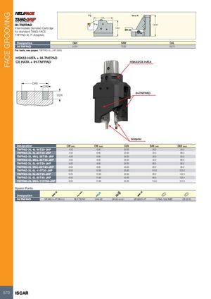 FACE GROOVING A View A OAL IH-TNFPAD OAW Intermediate Serrated Cartridge OAH for standard TANG-FACE TNFPAD-XL R Adapters Designation OAH OAW OAL IH-TNFPAD 54.00 73.00 65.70 For tools, see pages: TNFPAD-XL-JHP (569) HSK63 HATA + IH-TNFPAD C6 HATA + IH-TNFPAD HSK63/C6 HATA DAX CW CDX IH-TNFPAD Adapter Designation CW (min) CW (max) CDX DAX (min) DAX (max) TNFPAD-XL 4L-35T20-JHP 4.00 6.90 20.00 35.0 53.0 TNFPAD-XL 4L-45T20-JHP 4.00 6.90 20.00 45.0 68.0 TNFPAD-XL 4R/L-35T35-JHP 4.00 6.90 35.00 35.0 53.0 TNFPAD-XL 4R/L-45T35-JHP 4.00 6.90 35.00 45.0 68.0 TNFPAD-XL 5L-60T20-JHP 5.00 8.90 20.00 60.0 90.0 TNFPAD-XL 5R/L-60T40-JHP 5.00 8.90 40.00 60.0 90.0 TNFPAD-XL 6L-110T20-JHP 6.00 10.90 20.00 110.0 312.0 TNFPAD-XL 6L-80T20-JHP 6.00 10.90 20.00 80.0 122.0 TNFPAD-XL 6L-80T45-JHP 6.00 10.90 45.00 80.0 122.0 TNFPAD-XL 6R/L-110T50-JHP 6.00 10.90 50.00 110.0 312.0 Spare Parts Designation IH-TNFPAD SR M6X14-XT DIN 912 BLD T20/M7 SW6-SD SR M5-04451 SR M6X20-XT O-RING 19X2 NBR OR 5X1N 570 ISCAR