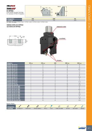 FACE GROOVING A View A OAL IH-HFPAD OAW Intermediate Serrated Cartridge OAH For standard HFPAD R Adapters Designation OAH OAW OAL IH-HFPAD 54.00 73.00 58.90 For tools, see pages: HFPAD-3 (562) • HFPAD-4 (563) • HFPAD-5 (563) • HFPAD-6 (564) HSK63 HATA+IH-HFPAD C6 HATA+IH-HFPAD HSK63/C6 HATA DAX CW IH-HFPAD CDX Adapter Adapters CW (min) CW (max) CDX DAX (min) DAX (max) HFPAD 3R-25-T10 3 5.1 10 25 30 HFPAD 3R-30-T10 3 5.1 10 30 40 HFPAD 3R-40-T10 3 5.1 10 40 65 HFPAD 3R-65-T18 3 5.1 18 65 99.2 HFPAD 4R-25-T10 4 6.9 10 25 31 HFPAD 4R-31-T10 4 6.9 10 31 44 HFPAD 4R-44-T14 4 6.9 14 44 58 HFPAD 4R-58-T14 4 6.9 14 58 88 HFPAD 4R-88-T14 4 6.9 14 88 100.8 HFPAD 5R-40-T14 5 8.1 14 40 50 HFPAD 5R-50-T14 5 8.1 14 50 75 HFPAD 5R-75-T14 5 8.1 14 75 101.8 HFPAD 6R-60-T14 6 10.1 14 60 100 HFPAD 6R-100-T20 6 10.1 20 100 102.8 HFPAD 3R-30-T10-JHP 3 5.1 10 30 40 HFPAD 3R-40-T10-JHP 3 5.1 10 40 65 HFPAD 3R-65-T18-JHP 3 5.1 18 65 99.2 HFPAD 4R-44-T14-JHP 4 6.9 14 44 58 HFPAD 4R-58-T14-JHP 4 6.9 14 58 88 HFPAD 4R-88-T14-JHP 4 6.9 14 88 100.8 HFPAD 5R-40-T14-JHP 5 8.1 14 40 50 HFPAD 5R-75-T14-JHP 5 8.1 14 75 101.8 HFPAD 6R-60-T14-JHP 6 10.1 14 60 100 HFPAD 6R-100-T20-JHP 6 10.1 20 100 102.8 Spare Parts Designation IH-HFPAD SR M6X20-XT SR M5-04451 SR M6X12DIN6912 HW 5.0 T-20/5 O-RING 19X2 NBR OR 5X1N BLD T20/M7 SW6-SD 571