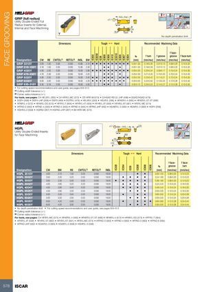 FACE GROOVING IC830 IC8250 IC08 IC808 IC908 IC418 IC5010IC328 IC806 IC807IC354 IC804 IC08 IC808 IC908 IC806 GRIP (full radius) INSL (Ref.)±0.1 Utility Double-Ended Full Radius Inserts for External, 7° Internal and Face Machining CW RE BW No depth penetration limit Dimensions Tough 1 Hard Recommended Machining Data f face- ap f turn f groove groove f face-turn Designation CW RE CWTOL(1) RETOL(2) INSL BW (mm) (mm/rev) (mm/rev) (mm/rev) (mm/rev) GRIP 3015Y 3.00 1.50 0.05 0.050 15.80 2.10 • • • • • • • • • • 0.00-1.50 0.18-0.26 0.07-0.13 0.08-0.20 0.10-0.20 GRIP 318-159Y 3.18 1.59 0.05 0.050 15.80 2.30 • • • 0.00-1.50 0.19-0.28 0.07-0.13 0.08-0.20 0.10-0.20 GRIP 4020Y 4.00 2.00 0.05 0.050 19.00 2.80 • • • • • • • • • • 0.00-2.00 0.20-0.34 0.09-0.17 0.10-0.24 0.15-0.30 GRIP 476-238Y 4.76 2.38 0.05 0.050 19.00 3.20 • • • • 0.00-2.30 0.21-0.40 0.10-0.20 0.10-0.24 0.15-0.30 GRIP 5025Y 5.00 2.50 0.05 0.050 19.00 3.40 • • • • • • • • 0.00-2.50 0.23-0.42 0.11-0.21 0.12-0.24 0.15-0.35 GRIP 6030Y 6.00 3.00 0.05 0.050 19.00 4.20 • • • • • • • • • 0.00-3.00 0.24-0.50 0.13-0.25 0.12-0.28 0.15-0.40 GRIP 635-318Y 6.35 3.18 0.05 0.050 19.00 4.00 • • • 0.00-3.10 0.25-0.53 0.14-0.27 0.12-0.28 0.15-0.40 • For cutting speed recommendations and user guide, see pages 604-613 (1) Cutting width tolerance (+/-) (2) Corner radius tolerance (+/-) For tools, see pages: C#-HELIR/L (265) • C#-HFIR/L-MC (573) • CR HFIR-M (575) • D/HGAD RE/LE-JHP (499) • DGAD/HGAD (479) • DGFH (268) • DGFH-JHP (269) • DGFS (469) • DGTR/L (476) • HELIIR/L (355) • HELIR/L (266) • HFAER/L-4 (565) • HFAER/L-5T, 6T (566) • HFAIR/L-4 (572) • HFAIR/L-DG (573) • HFFR/L-T (564) • HFHR/L-4T (559) • HFHR/L-5T (560) • HFHR/L-6T (561) • HFIR/L-MC (574) • HFPAD-3 (562) • HFPAD-4 (563) • HFPAD-5 (563) • HFPAD-6 (564) • HFPAD-JHP (562) • HGAER/L-3 (565) • HGAIR/L-3 (568) • HGFH (268) • HGHR/L-3 (558) • HGPAD (267) • HGPAD-JHP (267) • IM-HFIR-MC (574) HGPL ±0.1 INSL CW Utility Double-Ended Inserts 7° for Face Machining BW RE CW Dimensions Tough 1 Hard Recommended Machining Data f face- f face- ap groove turn Designation CW BW RE CWTOL(1) RETOL(2) INSL (mm) (mm/rev) (mm/rev) HGPL 3015Y 3.00 2.10 1.50 0.03 0.050 16.00 • • 0.00-1.50 0.08-0.20 0.12-0.23 HGPL 3002Y 3.00 2.30 0.20 0.03 0.050 16.00 • • • • 0.24-1.80 0.08-0.20 0.12-0.23 HGPL 3003Y 3.00 2.30 0.30 0.03 0.050 16.00 • • • • • 0.36-1.80 0.08-0.20 0.12-0.23 HGPL 4002Y 4.00 2.80 0.20 0.03 0.050 19.00 • • • • 0.24-2.40 0.10-0.24 0.16-0.30 HGPL 4004Y 4.00 2.80 0.40 0.03 0.050 19.00 • • • • 0.48-2.40 0.10-0.24 0.16-0.30 HGPL 4020Y 4.00 2.80 2.00 0.03 0.050 19.00 • • • 0.00-2.00 0.10-0.24 0.16-0.30 HGPL 5005Y 5.00 3.30 0.50 0.03 0.050 19.00 • • • 0.60-3.00 0.12-0.24 0.20-0.38 HGPL 5025Y 5.00 3.30 2.50 0.03 0.050 19.00 • • • 0.00-2.50 0.12-0.24 0.20-0.38 HGPL 6005Y 6.00 4.20 0.50 0.03 0.050 19.00 • • • • 0.60-3.60 0.12-0.28 0.24-0.45 HGPL 6030Y 6.00 4.20 3.00 0.03 0.050 19.00 • • • 0.00-3.00 0.12-0.28 0.24-0.45 • No depth penetration limit • For cutting speed recommendations and user guide, see pages 604-613 (1) Cutting width tolerance (+/-) (2) Corner radius tolerance (+/-) For tools, see pages: C#-HFIR/L-MC (573) • HFAER/L-4 (565) • HFAER/L-5T, 6T (566) • HFAIR/L-4 (572) • HFAIR/L-DG (573) • HFFR/L-T (564) • HFHR/L-4T (559) • HFHR/L-5T (560) • HFHR/L-6T (561) • HFIR/L-MC (574) • HFPAD-3 (562) • HFPAD-4 (563) • HFPAD-5 (563) • HFPAD-6 (564) • HFPAD-JHP (562) • HGAER/L-3 (565) • HGAIR/L-3 (568) • HGHR/L-3 (558) 578 ISCAR