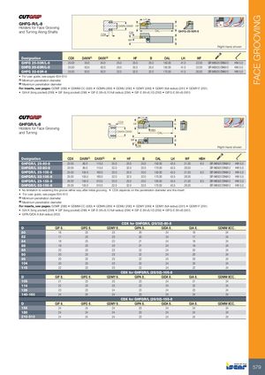 FACE GROOVING LH GHFG-R/L-8Holders for Face Grooving DAXN-DAXX HF H and Turning Along Shafts CDX CW OAL GHFG-25-50R-8 WF B Right-hand shown Designation CDX DAXN(1) DAXX(2) H HF B OAL LH WF GHFG 25-50R/L-8 25.00 50.0 64.0 25.0 25.0 25.0 150.00 41.0 22.00 SR M6X20 DIN912 HW 5.0 GHFG 25-63R/L-8 25.00 63.0 82.0 25.0 25.0 25.0 150.00 41.0 22.00 SR M6X20 DIN912 HW 5.0 GHFG 32-63R-8 25.00 63.0 82.0 32.0 32.0 32.0 170.00 41.0 30.00 SR M6X20 DIN912 HW 5.0 • For user guide, see pages 604-613 (1) Minimum penetration diameter (2) Maximum penetration diameter For inserts, see pages: GDMF (288) • GDMM-CC (583) • GDMN (289) • GDMU (290) • GDMY (289) • GDMY (full radius) (291) • GDMY-F (291) • GIA-K (long pocket) (299) • GIF (long pocket) (298) • GIF-E (W=8,10 full radius) (294) • GIF-E (W=8,10) (292) • GIFG-E (W=8) (581) LH GHFGR/L-8 CDX HF H Holders for Face Groovingand Turning DAXN-DAXX HBH OAL WF B CW Right-hand shown Designation CDX DAXN(1) DAXX(2) H HF B OAL LH WF HBH GHFGR/L 25-80-8 23.00 80.0 115.0 25.0 25.0 25.0 150.00 43.5 21.30 6.0 SR M6X20 DIN912 HW 5.0 GHFGR/L 32-80-8 23.00 80.0 115.0 32.0 32.0 32.0 170.00 43.5 28.30 - SR M6X20 DIN912 HW 5.0 GHFGR/L 25-105-8 25.00 105.0 160.0 25.0 25.0 25.0 150.00 43.5 21.30 6.0 SR M6X20 DIN912 HW 5.0 GHFGR/L 32-105-8 25.00 105.0 160.0 32.0 32.0 32.0 170.00 43.5 28.30 - SR M6X20 DIN912 HW 5.0 GHFGR/L 25-155-8 25.00 155.0 510.0 25.0 25.0 25.0 150.00 43.5 21.30 6.0 SR M6X20 DIN912 HW 5.0 GHFGR/L 32-155-8 25.00 155.0 510.0 32.0 32.0 32.0 170.00 43.5 28.30 - SR M6X20 DIN912 HW 5.0 • No limitation to widening the groove either way after initial grooving • CDX depends on the penetration diameter and the insert • For user guide, see pages 604-613 (1) Minimum penetration diameter (2) Maximum penetration diameter For inserts, see pages: GDMF (288) • GDMM-CC (583) • GDMN (289) • GDMU (290) • GDMY (289) • GDMY (full radius) (291) • GDMY-F (291) • GIA-K (long pocket) (299) • GIF (long pocket) (298) • GIF-E (W=8,10 full radius) (294) • GIF-E (W=8,10) (292) • GIFG-E (W=8) (581) • GIPA/GIDA 8 (full radius) (302) CDX for GHFGR/L (25/32)-80-8 D GIF 8… GIFG 8… GDMY 8… GIPA 8… GIDA 8… GIA 8… GDMM 8CC… 80 16 23 23 20 24 16 24 82 17 23 23 20 24 17 24 84 18 23 23 21 24 18 24 86 19 23 23 21 24 19 24 88 20 23 23 22 24 20 24 90 20 23 23 22 24 20 24 96 20 23 23 22 24 20 24 104 20 23 23 22 24 20 24 115 22 23 23 22 24 22 24 CDX for GHFGR/L (25/32)-105-8 D GIF 8… GIFG 8… GDMY 8… GIPA 8… GIDA 8… GIA 8… GDMM 8CC… 105 21 23 23 23 24 21 24 114 22 23 23 23 24 22 24 126 23 23 24 23 24 23 24 140-160 24 24 24 23 24 24 24 CDX for GHFGR/L (25/32)-155-8 D GIF 8… GIFG 8… GDMY 8… GIPA 8… GIDA 8… GIA 8… GDMM 8CC… 155 24 24 24 23 24 24 24 180 24 24 24 23 24 24 24 210-510 24 24 24 23 24 24 24 579