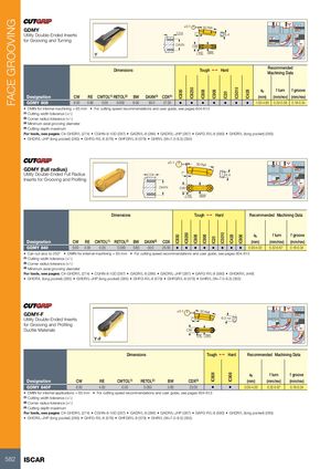 FACE GROOVING IC830 IC830 IC8250 IC8250 IC808 IC808IC908 IC908IC20IC808 IC20IC5010 IC428IC908 IC5010 IC806 IC428 GDMY ±0.1 30 Ref. Utility Double-Ended Inserts CDX 7° 6.4 for Grooving and Turning DAXN CW RE BW Dimensions Tough 1 Hard RecommendedMachining Data ap f turn f groove Designation CW RE CWTOL(1) RETOL(2) BW DAXN(3) CDX(4) (mm) (mm/rev) (mm/rev) GDMY 808 8.00 0.80 0.05 0.050 6.00 50.0 27.00 • • • • • • • 1.00-4.80 0.32-0.56 0.18-0.34 • DMIN for internal machining = 65 mm • For cutting speed recommendations and user guide, see pages 604-613 (1) Cutting width tolerance (+/-) (2) Corner radius tolerance (+/-) (3) Minimum axial grooving diameter (4) Cutting depth maximum For tools, see pages: C#-GHDR/L (274) • CGHN-8-10D (287) • GADR/L-8 (286) • GADR/L-JHP (287) • GAFG-R/L-8 (580) • GHDR/L (long pocket) (285) • GHDR/L-JHP (long pocket) (285) • GHFG-R/L-8 (579) • GHFGR/L-8 (579) • GHIR/L (W=7.0-8.3) (355) ±0.1 30 Ref. GDMY (full radius) Utility Double-Ended Full Radius CDX 7° 6.4 Inserts for Grooving and Profiling DAXN CW RE BW Dimensions Tough 1 Hard Recommended Machining Data ap f turn f groove Designation CW RE CWTOL(1) RETOL(2) BW DAXN(3) CDX (mm) (mm/rev) (mm/rev) GDMY 840 8.00 4.00 0.05 0.050 5.60 50.0 25.00 • • • • • • • • 0.00-4.00 0.32-0.67 0.18-0.34 • Can cut arcs to 250° • DMIN for internal machining = 65 mm • For cutting speed recommendations and user guide, see pages 604-613 (1) Cutting width tolerance (+/-) (2) Corner radius tolerance (+/-) (3) Minimum axial grooving diameter For tools, see pages: C#-GHDR/L (274) • CGHN-8-10D (287) • GADR/L-8 (286) • GADR/L-JHP (287) • GAFG-R/L-8 (580) • GHDKR/L (446) • GHDR/L (long pocket) (285) • GHDR/L-JHP (long pocket) (285) • GHFG-R/L-8 (579) • GHFGR/L-8 (579) • GHIR/L (W=7.0-8.3) (355) GDMY-F ±0.1 30 Ref. Utility Double-Ended Inserts 7º 6.3 Ref. for Grooving and Profiling Ductile Materials CW RE BW Dimensions Tough 1 Hard Recommended Machining Data ap f turn f groove Designation CW RE CWTOL(1) RETOL(2) BW CDX(3) (mm) (mm/rev) (mm/rev) GDMY 840F 8.00 4.00 0.05 0.050 5.60 25.00 • • 0.00-4.00 0.32-0.67 0.18-0.34 • DMIN for internal applications = 65 mm • For cutting speed recommendations and user guide, see pages 604-613 (1) Cutting width tolerance (+/-) (2) Corner radius tolerance (+/-) (3) Cutting depth maximum For tools, see pages: C#-GHDR/L (274) • CGHN-8-10D (287) • GADR/L-8 (286) • GADR/L-JHP (287) • GAFG-R/L-8 (580) • GHDR/L (long pocket) (285) • GHDR/L-JHP (long pocket) (285) • GHFG-R/L-8 (579) • GHFGR/L-8 (579) • GHIR/L (W=7.0-8.3) (355) 582 ISCAR