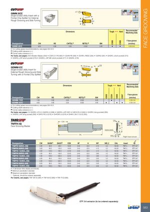 IC830 IC808IC354 IC808 IC908 IC907 FACE GROOVING ±0.1 GIMM 8CC Single-Ended Utility Insert with a Frontal Chip Splitter for External 15.3 Ref. Rough Grooving and Side Turning CW BW RE Dimensions Tough 1 Hard RecommendedMachining Data f face-groove Designation CW RE CWTOL(1) RETOL(2) BW (mm/rev) GIMM 8CC 8.00 0.80 0.05 0.050 5.80 • • 0.30-0.45 • For cutting speed recommendations, see pages 604-613 (1) Cutting width tolerance (+/-) (2) Corner radius tolerance (+/-) For tools, see pages: Anti-Vibration Blades (284) • CGFG 51-P8 (580) • CGHN-P8 (283) • CGHR/L-P8DG (284) • CGPAD (281) • GHDR/L (short pocket) (275) • GHDR/L-JHP (short pocket) (276) • GHDR/L-JHP-MC (short pocket) (277) • GHGR/L (278) GDMM-CC 29.95 Ref. CW Single-Ended Utility Insert for External Rough Grooving and Side RE BW Turning with a Frontal Chip Splitter Dimensions Tough 1 Hard RecommendedMachining Data f face-groove Designation CW RE CWTOL(1) RETOL(2) BW (mm/rev) GDMM 7CC 7.00 0.80 0.05 0.050 6.00 • 0.30-0.45 GDMM 8CC 8.00 0.80 0.05 0.050 5.60 • • • 0.30-0.45 • For cutting speed recommendations, see pages 604-613 (1) Cutting width tolerance (+/-) (2) Corner radius tolerance (+/-) For tools, see pages: C#-GHDR/L (274) • GADR/L-8 (286) • GADR/L-JHP (287) • GAFG-R/L-8 (580) • GHDR/L (long pocket) (285) • GHDR/L-JHP (long pocket) (285) • GHFG-R/L-8 (579) • GHFGR/L-8 (579) • GHIR/L (W=7.0-8.3) (355) CW CDX TNFFH-IQ Face Grooving Blades HF H DAXN-DAXX OAL WFWB_2 Right-hand shown Designation CW DAXN(1) DAXX(2) CDX HF H WF WB_2 OAL Insert TNFFH 65R/L-3IQ 3.00 65.0 90.0 18.00 24.8 32.0 4.10 5.2 150.00 TNF 3... ETF 3-6* TNFFH 90R/L-3IQ 3.00 90.0 120.0 18.00 24.8 32.0 4.10 5.2 150.00 TNF 3... ETF 3-6* TNFFH 120R/L-3IQ 3.00 120.0 160.0 24.00 24.8 32.0 4.10 5.2 150.00 TNF 3... ETF 3-6* TNFFH 80R/L-4IQ 4.00 80.0 150.0 32.00 24.8 32.0 3.80 5.2 150.00 TNF 4... ETF 3-6* TNFFH 150R/L-4IQ 4.00 150.0 500.0 32.00 24.8 32.0 3.80 5.2 150.00 TNF 4... ETF 3-6* TNFFH 80R/L-5IQ 5.00 80.0 150.0 30.00 24.8 32.0 3.50 5.2 150.00 TNF 5... ETF 3-6* TNFFH 150R/L-5IQ 5.00 150.0 500.0 35.00 24.8 32.0 3.50 5.2 150.00 TNF 5... ETF 3-6* TNFFH 80R/L-6IQ 6.00 80.0 150.0 30.00 24.8 32.0 3.30 5.2 150.00 TNF 6... ETF 3-6* TNFFH 150R/L-6IQ 6.00 150.0 700.0 35.00 24.8 32.0 3.30 5.2 150.00 TNF 6... ETF 3-6* • H dimension links blades and blocks (1) Minimum penetration diameter (2) Maximum penetration diameter * Optional, should be ordered separately For inserts, see pages: TNF GN-IQ (585) • TNF-M-IQ (585) • TNF-P-IQ (585) ETF 3-6 extractor (to be ordered separately) 583