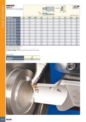 FACE GROOVING WF TNFFA-IQ DAXN-DAXX Reinforced Face Grooving Blades HF H CW OAL WB_2 CDX Right-hand shown Designation CW DAXN(1) DAXX(2) CDX H WF HF OAL WB_2 Insert TNFFA 30R/L-3IQ 3.00 30.0 35.0 19.00 32.0 9.50 24.8 90.00 18.5 TNF 3... TNFFA 35R/L-3IQ 3.00 35.0 40.0 19.00 32.0 9.50 24.8 90.00 18.5 TNF 3... TNFFA 40R/L-3IQ 3.00 40.0 46.0 23.00 32.0 9.50 24.8 90.00 18.5 TNF 3... TNFFA 46R/L-3IQ 3.00 46.0 54.0 25.00 32.0 9.50 24.8 90.00 18.5 TNF 3... TNFFA 54R/L-3IQ 3.00 54.0 65.0 26.00 32.0 9.50 24.8 90.00 18.5 TNF 3... TNFFA 65R/L-3IQ 3.00 65.0 80.0 27.00 32.0 9.50 24.8 90.00 18.5 TNF 3... TNFFA 80R/L-3IQ 3.00 80.0 100.0 27.00 32.0 9.50 24.8 90.00 16.7 TNF 3... TNFFA 35R/L-4IQ 4.00 35.0 45.0 25.00 32.0 9.00 24.8 90.00 18.1 TNF 4... TNFFA 45R/L-4IQ 4.00 45.0 60.0 25.00 32.0 9.00 24.8 90.00 17.3 TNF 4... TNFFA 60R/L-4IQ 4.00 60.0 80.0 27.00 32.0 9.00 24.8 90.00 18.0 TNF 4... TNFFA 80R/L-4IQ 4.00 80.0 130.0 27.00 32.0 9.00 24.8 90.00 14.8 TNF 4... TNFFA 40R/L-5IQ 5.00 40.0 50.0 25.00 32.0 9.70 24.8 90.00 18.0 TNF 5... TNFFA 50R/L-5IQ 5.00 50.0 70.0 28.00 32.0 9.70 24.8 90.00 18.0 TNF 5... TNFFA 70R/L-5IQ 5.00 70.0 100.0 30.00 32.0 9.70 24.8 90.00 18.0 TNF 5... TNFFA 100R/L-5IQ 5.00 100.0 180.0 35.00 32.0 9.70 24.8 90.00 18.0 TNF 5... TNFFA 45R/L-6IQ 6.00 45.0 60.0 25.00 32.0 10.20 24.8 90.00 18.0 TNF 6... TNFFA 60R/L-6IQ 6.00 60.0 80.0 28.00 32.0 10.20 24.8 90.00 18.0 TNF 6... TNFFA 80R/L-6IQ 6.00 80.0 110.0 30.00 32.0 10.20 24.8 90.00 18.0 TNF 6... TNFFA 110R/L-6IQ 6.00 110.0 300.0 35.00 32.0 10.20 24.8 90.00 14.8 TNF 6... • For user guide, see pages 604-613 (1) Minimum penetration diameter (2) Maximum penetration diameter For inserts, see pages: TNF GN-IQ (585) • TNF-M-IQ (585) • TNF-P-IQ (585) Spare Parts Designation TNFFA-IQ ETF 3-6* * Optional, should be ordered separately 584 ISCAR