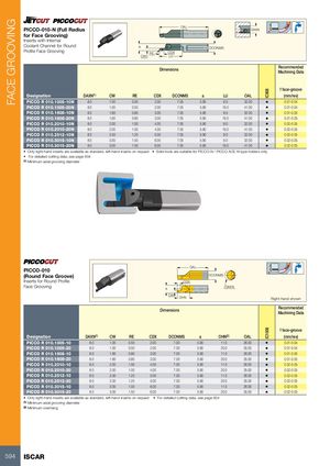 FACE GROOVING IC908IC1008 PICCO-010-N (Full Radius OAL DAXN for Face Grooving) Inserts with Internal Coolant Channel for Round a DCONMS Profile Face Grooving RE CDX CW LU Dimensions RecommendedMachining Data f face-groove Designation DAXN(1) CW RE CDX DCONMS a LU OAL (mm/rev) PICCO R 010.1005-10N 8.0 1.00 0.50 2.00 7.05 5.90 9.0 32.00 • 0.01-0.04 PICCO R 010.1005-20N 8.0 1.00 0.50 2.00 7.05 5.90 19.0 41.00 • 0.01-0.04 PICCO R 010.1608-10N 8.0 1.60 0.80 3.00 7.05 5.90 9.0 32.00 • 0.01-0.05 PICCO R 010.1608-20N 8.0 1.60 0.80 3.00 7.05 5.90 19.0 41.00 • 0.01-0.05 PICCO R 010.2010-10N 8.0 2.00 1.00 4.00 7.05 5.90 9.0 32.00 • 0.02-0.05 PICCO R 010.2010-20N 8.0 2.00 1.00 4.00 7.05 5.90 19.0 41.00 • 0.02-0.05 PICCO R 010.2512-10N 8.0 2.50 1.25 5.00 7.05 5.90 9.0 32.00 • 0.02-0.05 PICCO R 010.3015-10N 8.0 3.00 1.50 6.00 7.05 5.90 9.0 32.00 • 0.02-0.05 PICCO R 010.3015-20N 8.0 3.00 1.50 6.00 7.05 5.90 19.0 41.00 • 0.02-0.05 • Only right-hand inserts are available as standard, left-hand inserts on request • Solid tools are suitable for PICCO-N / PICCO ACE-N type holders only • For detailed cutting data, see page 604 (1) Minimum axial grooving diameter OAL PICCO-010 (Round Face Groove) DCONMS Inserts for Round Profile CDX Face Grooving a DAXN CW OHN Right-hand shown Dimensions RecommendedMachining Data f face-groove Designation DAXN(1) CW RE CDX DCONMS a OHN(2) OAL (mm/rev) PICCO R 010.1005-10 8.0 1.00 0.50 2.00 7.00 5.90 11.0 26.00 • 0.01-0.04 PICCO R 010.1005-20 8.0 1.00 0.50 2.00 7.00 5.90 20.0 35.00 • 0.01-0.04 PICCO R 010.1608-10 8.0 1.60 0.80 3.00 7.00 5.90 11.0 26.00 • 0.01-0.05 PICCO R 010.1608-20 8.0 1.60 0.80 3.00 7.00 5.90 20.0 35.00 • 0.01-0.05 PICCO R 010.2010-10 8.0 2.00 1.00 4.00 7.00 5.90 11.0 26.00 • 0.02-0.05 PICCO R 010.2010-20 8.0 2.00 1.00 4.00 7.00 5.90 20.0 35.00 • 0.02-0.05 PICCO R 010.2512-10 8.0 2.50 1.25 5.00 7.00 5.90 11.0 26.00 • 0.02-0.05 PICCO R 010.2512-20 8.0 2.50 1.25 5.00 7.00 5.90 20.0 35.00 • 0.02-0.05 PICCO R 010.3015-10 8.0 3.00 1.50 6.00 7.00 5.90 11.0 26.00 • 0.02-0.05 PICCO R 010.3015-20 8.0 3.00 1.50 6.00 7.00 5.90 20.0 35.00 • 0.02-0.05 • Only right-hand inserts are available as standard, left-hand inserts on request • For detailed cutting data, see page 604 (1) Minimum axial grooving diameter (2) Minimum overhang 594 ISCAR