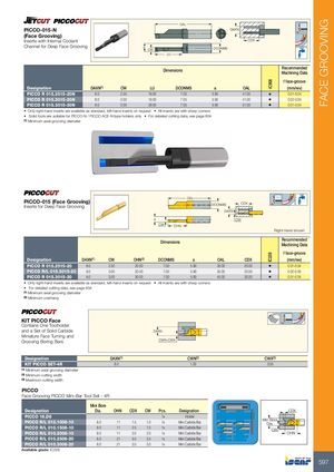 IC908IC228 FACE GROOVING OAL PICCO-015-N DAXN (Face Grooving) Inserts with Internal Coolant CDX Channel for Deep Face Grooving a CW DCONMS LU Dimensions RecommendedMachining Data f face-groove Designation DAXN(1) CW LU DCONMS a OAL (mm/rev) PICCO R 015.2515-20N 8.0 2.50 19.00 7.05 5.90 41.00 • 0.01-0.04 PICCO R 015.3015-20N 8.0 3.00 19.00 7.05 5.90 41.00 • 0.02-0.05 PICCO R 015.3015-30N 8.0 3.00 29.00 7.05 5.90 51.00 • 0.01-0.04 • Only right-hand inserts are available as standard, left-hand inserts on request • All inserts are with sharp corners • Solid tools are suitable for PICCO-N / PICCO ACE-N type holders only • For detailed cutting data, see page 604 (1) Minimum axial grooving diameter OAL PICCO-015 (Face Grooving)Inserts for Deep Face Grooving DCONMS CDX DAXN a CW CW OHN Right-hand shown Dimensions RecommendedMachining Data f face-groove Designation DAXN(1) CW OHN(2) DCONMS a OAL CDX (mm/rev) PICCO R 015.2515-20 8.0 2.50 20.00 7.00 5.90 35.00 20.00 • 0.01-0.04 PICCO R/L 015.3015-20 8.0 3.00 20.00 7.00 5.90 35.00 20.00 • 0.02-0.05 PICCO R 015.3015-30 8.0 3.00 30.00 7.00 5.90 45.00 30.00 • 0.01-0.04 • Only right-hand inserts are available as standard, left-hand inserts on request • All inserts are with sharp corners • For detailed cutting data, see page 604 (1) Minimum axial grooving diameter (2) Minimum overhang KITS KIT PICCO Face Contains One Toolholder and a Set of Solid Carbide DAXN Miniature Face Turning and Grooving Boring Bars CWN-CWX Designation DAXN(1) CWN(2) CWX(3) KIT PICCO SET-4R 8.0 1.00 3.00 (1) Minimum axial grooving diameter (2) Minimum cutting width (3) Maximum cutting width PICCO Face Grooving PICCO Mini-Bar Tool Set - 4R Mini Bore Designation Dia. OHN CDX CW Pcs. Designation CDX PICCO 16.D6 1x Holder PICCO R/L 010.1008-10 8.0 11 1.5 1.0 1x Mini Carbide Bar Min BoreDia. PICCO R/L 010.1508-10 8.0 11 2.5 1.5 1x Mini Carbide Bar CW PICCO R/L 010.2008-10 8.0 11 3.0 2.0 1x Mini Carbide Bar OHN PICCO R/L 010.2508-20 8.0 21 3.5 2.5 1x Mini Carbide Bar PICCO R/L 010.3008-20 8.0 21 3.5 3.0 1x Mini Carbide Bar Available grade: IC228 597