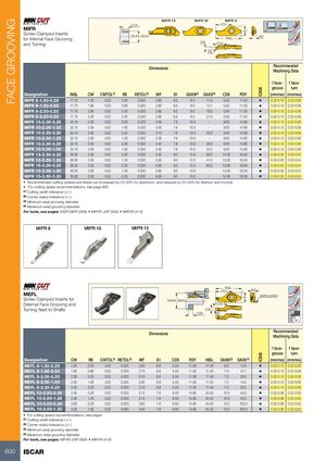 FACE GROOVING IC908IC908 MIFR 15 MIFR 10 MIFR 8 CDX PDY MIFRScrew-Clamped Inserts S1 for Internal Face Grooving DAXN-DAXX INSL WF and Turning CW CDX RE Dimensions RecommendedMachining Data f face- f face- groove turn Designation INSL CW CWTOL(1) RE RETOL(2) WF S1 DAXN(3) DAXX(4) CDX PDY (mm/rev) (mm/rev) MIFR 8-1.50-0.20 17.70 1.50 0.02 0.20 0.020 2.60 6.5 8.0 11.5 5.50 11.00 • 0.02-0.10 0.02-0.06 MIFR 8-1.60-0.80 17.70 1.60 0.02 0.80 0.020 2.60 6.5 8.0 12.1 5.50 11.00 • 0.02-0.10 0.02-0.06 MIFR 8-2.00-0.20 17.70 2.00 0.02 0.20 0.020 2.80 6.5 8.0 16.0 5.50 11.00 • 0.02-0.10 0.02-0.06 MIFR 8-2.20-0.20 17.70 2.20 0.02 0.20 0.020 2.90 6.5 8.0 21.0 5.50 11.00 • 0.02-0.10 0.02-0.06 MIFR 10-2.00-0.20 25.10 2.00 0.02 0.20 0.020 3.00 7.6 10.0 - 9.00 14.80 • 0.02-0.10 0.02-0.06 MIFR 10-2.00-1.00 25.10 2.00 0.02 1.00 0.020 3.00 7.6 10.0 - 9.00 14.80 • 0.02-0.10 0.02-0.06 MIFR 10-2.50-0.20 25.10 2.50 0.02 0.20 0.020 3.10 7.6 10.0 30.0 9.00 14.80 • 0.02-0.10 0.02-0.06 MIFR 10-2.50-1.25 25.10 2.50 0.02 1.25 0.020 3.30 7.6 10.0 - 9.00 14.80 • 0.02-0.10 0.02-0.06 MIFR 10-3.00-0.20 25.10 3.00 0.02 0.20 0.020 3.40 7.6 10.0 30.0 9.00 14.80 • 0.02-0.10 0.02-0.06 MIFR 10-3.00-1.50 25.10 3.00 0.02 1.50 0.020 3.30 7.6 10.0 34.0 9.00 14.80 • 0.02-0.10 0.02-0.06 MIFR 15-2.50-0.20 30.00 2.50 0.02 0.20 0.020 5.55 9.0 15.0 60.0 15.00 19.30 • 0.03-0.05 0.03-0.04 MIFR 15-2.50-1.25 30.00 2.50 0.02 1.25 0.020 5.55 9.0 12.0 47.0 15.00 19.30 • 0.03-0.05 0.03-0.04 MIFR 15-3.00-0.20 30.00 3.00 0.02 0.20 0.020 5.85 9.0 15.0 60.0 15.00 19.30 • 0.03-0.05 0.03-0.04 MIFR 15-3.00-1.50 30.00 3.00 0.02 1.50 0.020 5.85 9.0 10.0 - 15.00 19.30 • 0.03-0.05 0.03-0.04 MIFR 15-3.50-0.20 30.00 3.50 0.02 0.20 0.020 6.00 9.0 10.0 - 15.00 19.30 • 0.03-0.05 0.03-0.04 • Recommended cutting speeds and feeds can increased by 20-30% for aluminum, and reduced by 20-30% for titanium and Inconel • For cutting speed recommendations, see page 600 (1) Cutting width tolerance (+/-) (2) Corner radius tolerance (+/-) (3) Minimum axial grooving diameter (4) Maximum axial grooving diameter For tools, see pages: IHSR-MIFR (599) • MFHR-JHP (599) • MIFHR (413) INSLPDY WF MEFLScrew-Clamped Inserts for S1 DAXN-DAXXDAXN-DAXX External Face Grooving and CDX Turning Next to Shafts CW CDX RE Dimensions RecommendedMachining Data f face- f face- groove turn Designation CW RE CWTOL(1) RETOL(2) WF S1 CDX PDY INSL DAXN(3) DAXX(4) (mm/rev) (mm/rev) MEFL 8-1.50-0.20 1.50 0.20 0.02 0.020 2.60 6.6 5.50 11.00 17.40 8.0 15.0 • 0.02-0.10 0.02-0.06 MEFL 8-1.60-0.80 1.60 0.80 0.02 0.020 2.70 6.6 5.50 11.00 17.40 7.0 12.1 • 0.02-0.10 0.02-0.06 MEFL 8-2.00-0.20 2.00 0.20 0.02 0.020 3.10 6.6 5.50 11.00 17.40 7.0 20.0 • 0.02-0.10 0.02-0.06 MEFL 8-2.00-1.00 2.00 1.00 0.02 0.020 2.90 6.6 5.50 11.00 17.40 7.0 14.0 • 0.02-0.10 0.02-0.06 MEFL 8-2.20-0.20 2.20 0.20 0.02 0.020 3.10 6.6 5.50 11.00 17.40 7.0 20.0 • 0.02-0.10 0.02-0.06 MEFL 10-2.50-0.20 2.50 0.20 0.02 0.020 3.15 7.6 9.00 14.85 24.50 10.0 45.0 • 0.02-0.06 0.02-0.05 MEFL 10-2.50-1.25 2.50 1.25 0.02 0.020 3.15 7.6 9.00 14.85 24.50 10.0 45.0 • 0.02-0.06 0.02-0.05 MEFL 10-3.00-0.20 3.00 0.20 0.02 0.020 3.60 7.6 9.00 14.85 24.50 10.0 100.0 • 0.02-0.06 0.02-0.05 MEFL 10-3.00-1.50 3.00 1.50 0.02 0.020 3.40 7.6 9.00 14.85 24.50 10.0 100.0 • 0.02-0.06 0.02-0.05 • For cutting speed recommendations, see pages (1) Cutting width tolerance (+/-) (2) Corner radius tolerance (+/-) (3) Minimum axial grooving diameter (4) Maximum axial grooving diameter For tools, see pages: MFHR-JHP (599) • MIFHR (413) 600 ISCAR